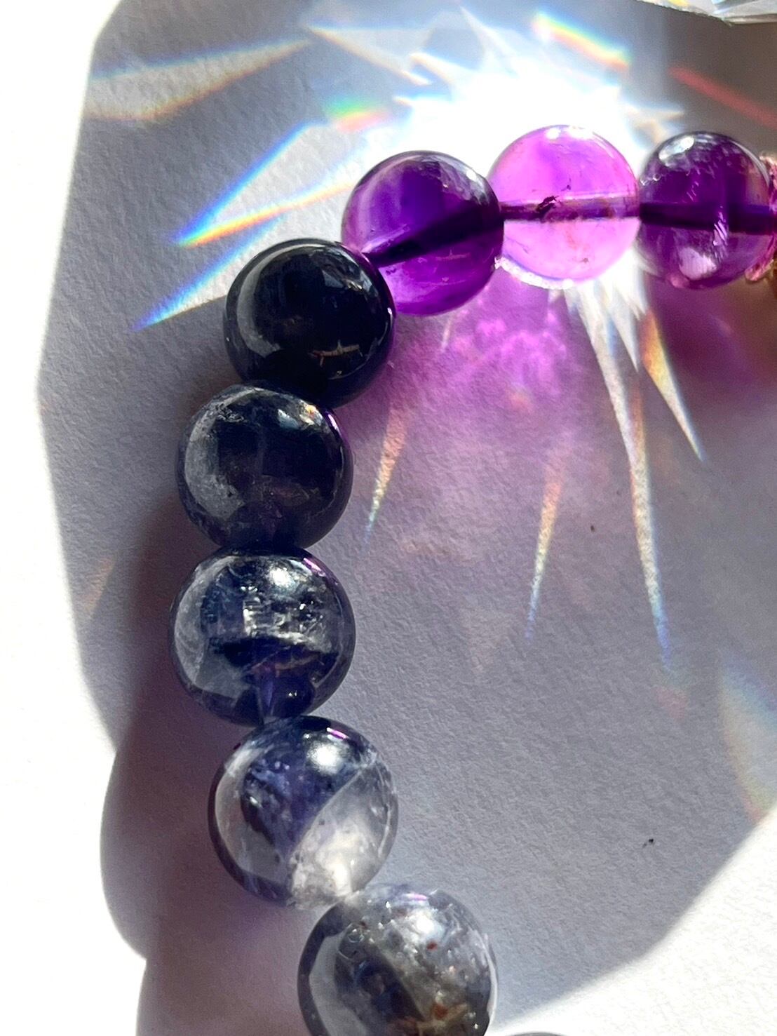 ソーダライトは直感力とコミュニケーション能力を高めるとされ、持つ人に自信と落ち着きを与えます。アイオライトは心の明晰さを促し、アメジストは癒しのエネルギーを持つ石として広く知られています。そして、ダルメシアンジャスパーは遊び心を象徴し、水晶は精神的なクリアさを提供します。このブレスレットはシンプルながらも存在感があり、日常のカジュアルなスタイルから特別なシーンまで幅広くご利用いただける一品です。