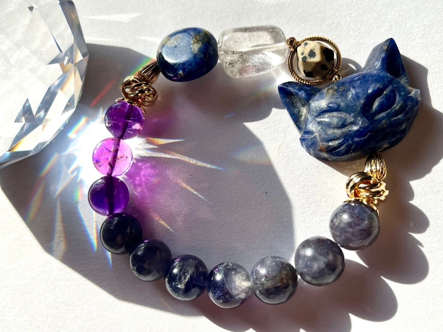 天然石 ブレスレット 猫 ソーダライト アイオライト アメジスト ダルメシアンジャスパー 水晶 パワーストーン