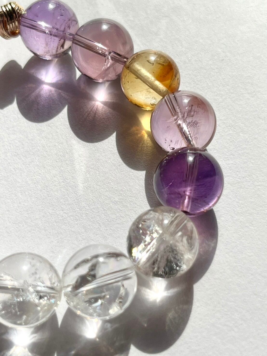 アメジストは、調和と心の平穏をもたらし、ストレスを和らげるとされています。アイリス水晶は視覚的な美しさを引き立てながら、持つ人に直感力を高める力があります。また、シトリンは幸福感をもたらし、ポジティブなエネルギーを引き寄せるとも言われています。このブレスレットは、シンプルでありながらも華やかさがあり、日常のカジュアルスタイルから特別なシーンまで幅広くご利用いただける一品です。