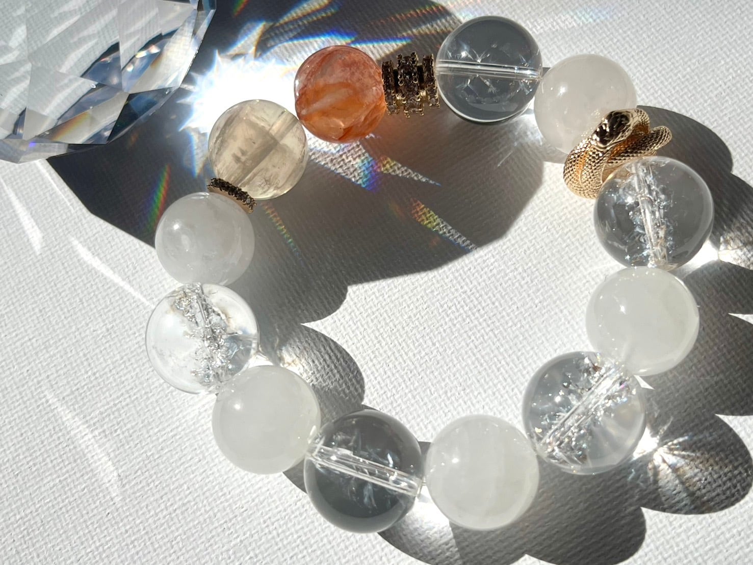 ヒマラヤ水晶は、浄化や癒しの力を持つ石として知られ、持つ人にポジティブなエネルギーを与えるとされています。また、グリーンフローライトは、心のバランスを整え、直感力を高める助けとなるパワーストーンです。ライモナイトは、土のエネルギーを感じさせ、安定感をもたらすと言われており、このブレスレットは、シンプルでありながら存在感があり、日常のカジュアルスタイルから特別なシーンまで幅広くご利用いただける一品です。