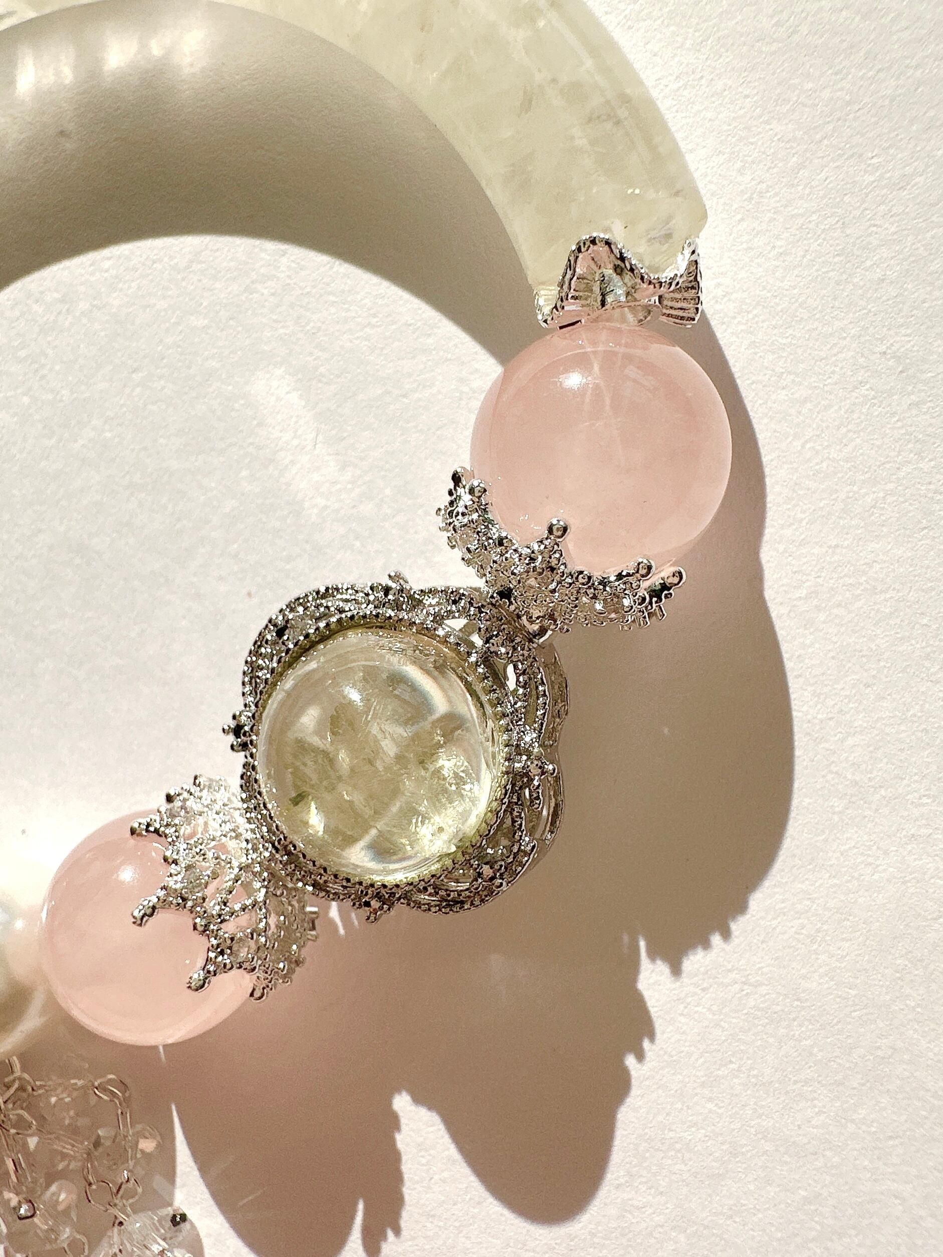 シトリンは、豊かさや自己表現を促すとされるパワーストーンです。心を明るくし、前向きな気持ちに導く力があるため、日常の中でポジティブなエネルギーを受け取りたい方にぴったりです。ローズクォーツは、愛や優しさを象徴し、心を癒す役割を果たします。このバングルは、シンプルながらも存在感のあるデザインで、特別なシーンやカジュアルな日常まで幅広くご利用いただける一品です。