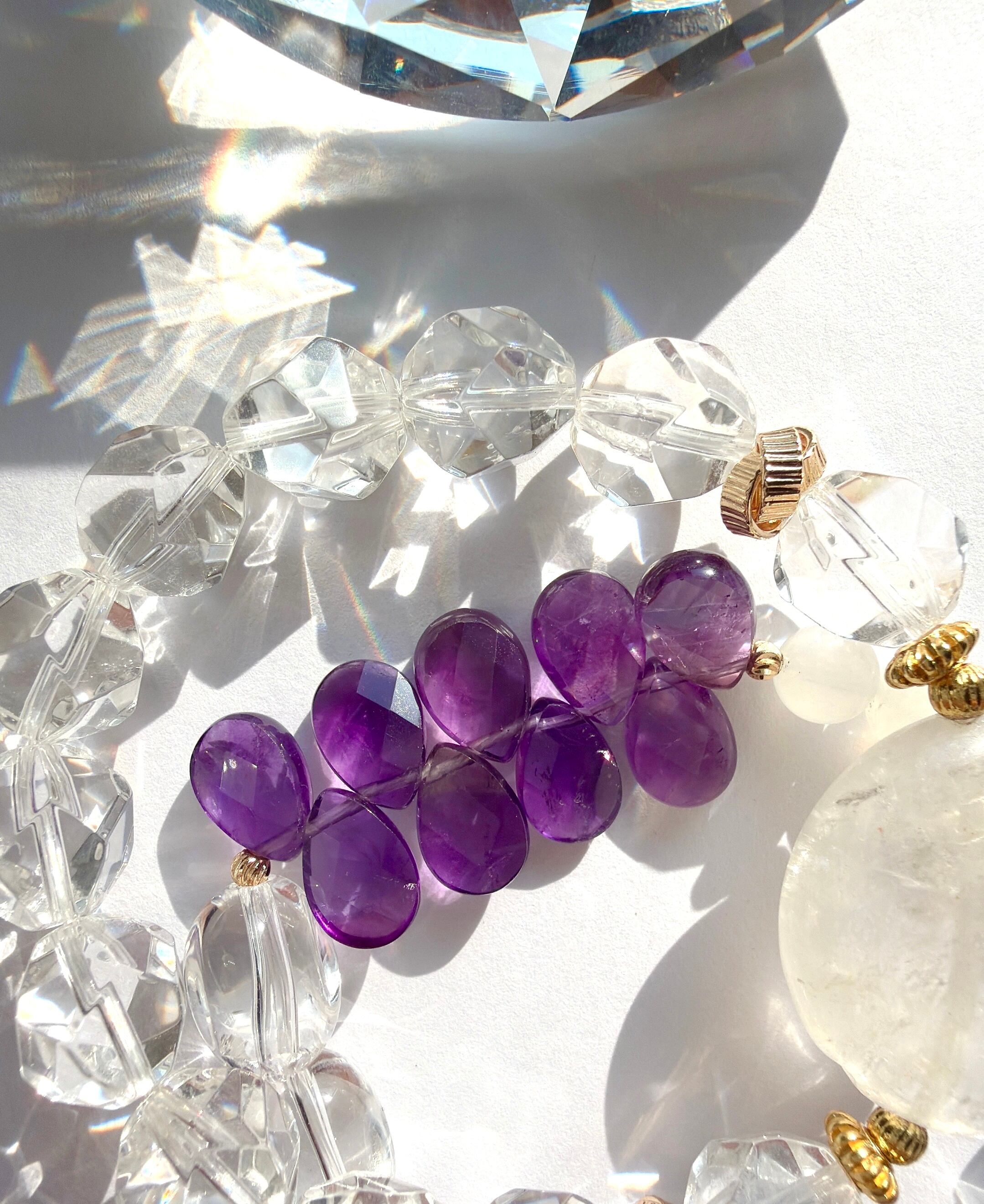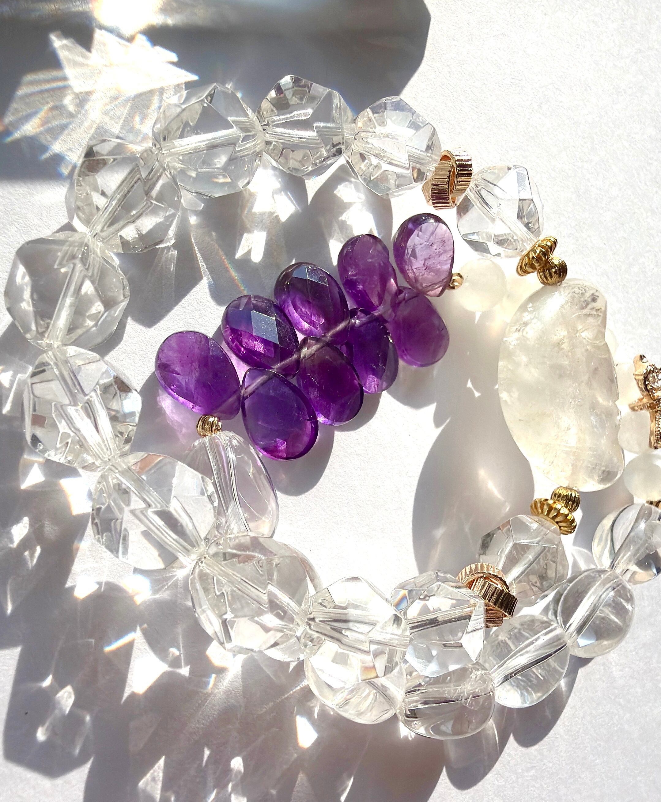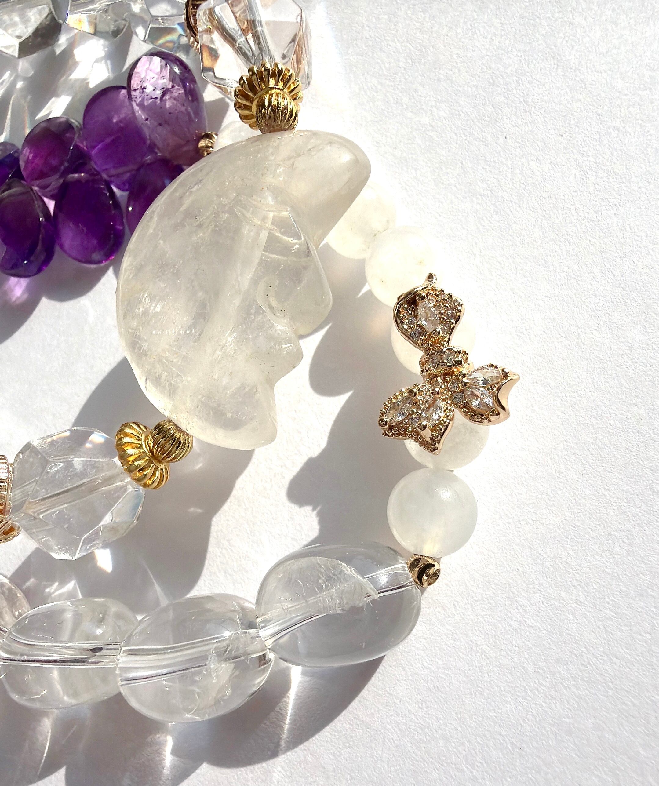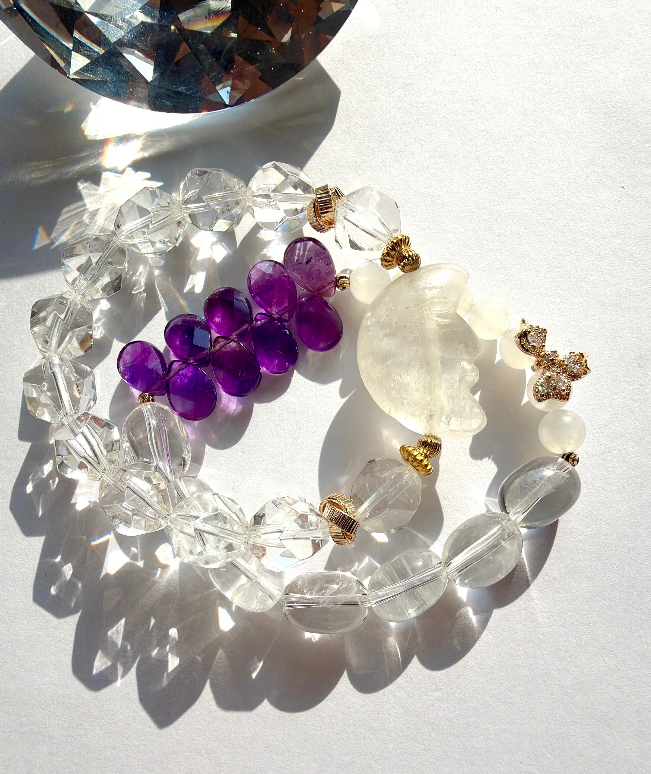 華やかで神秘的な二連ブレスレット 天然石 月 水晶 アメジスト ムーンストーン パワーストーンが新登場です!水晶で作られた月のモチーフが印象的なデザインに、雫型のアメジストとムーンストーンが組み合わさり、あなたの手元を一層魅力的に演出する様にコーディネートしました。この特別なブレスレットを、日々のファッションに取り入れてみてはいかがでしょうか?
