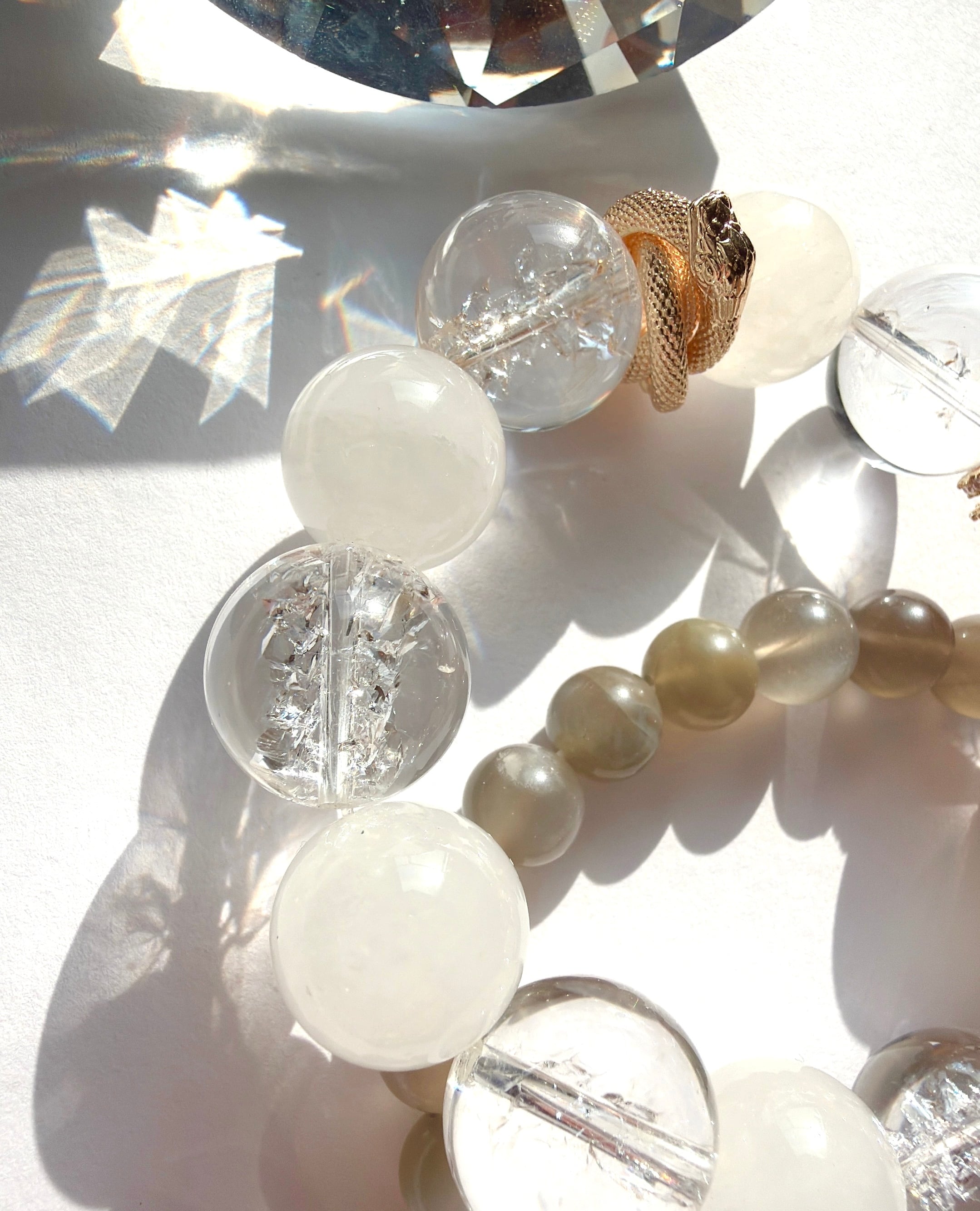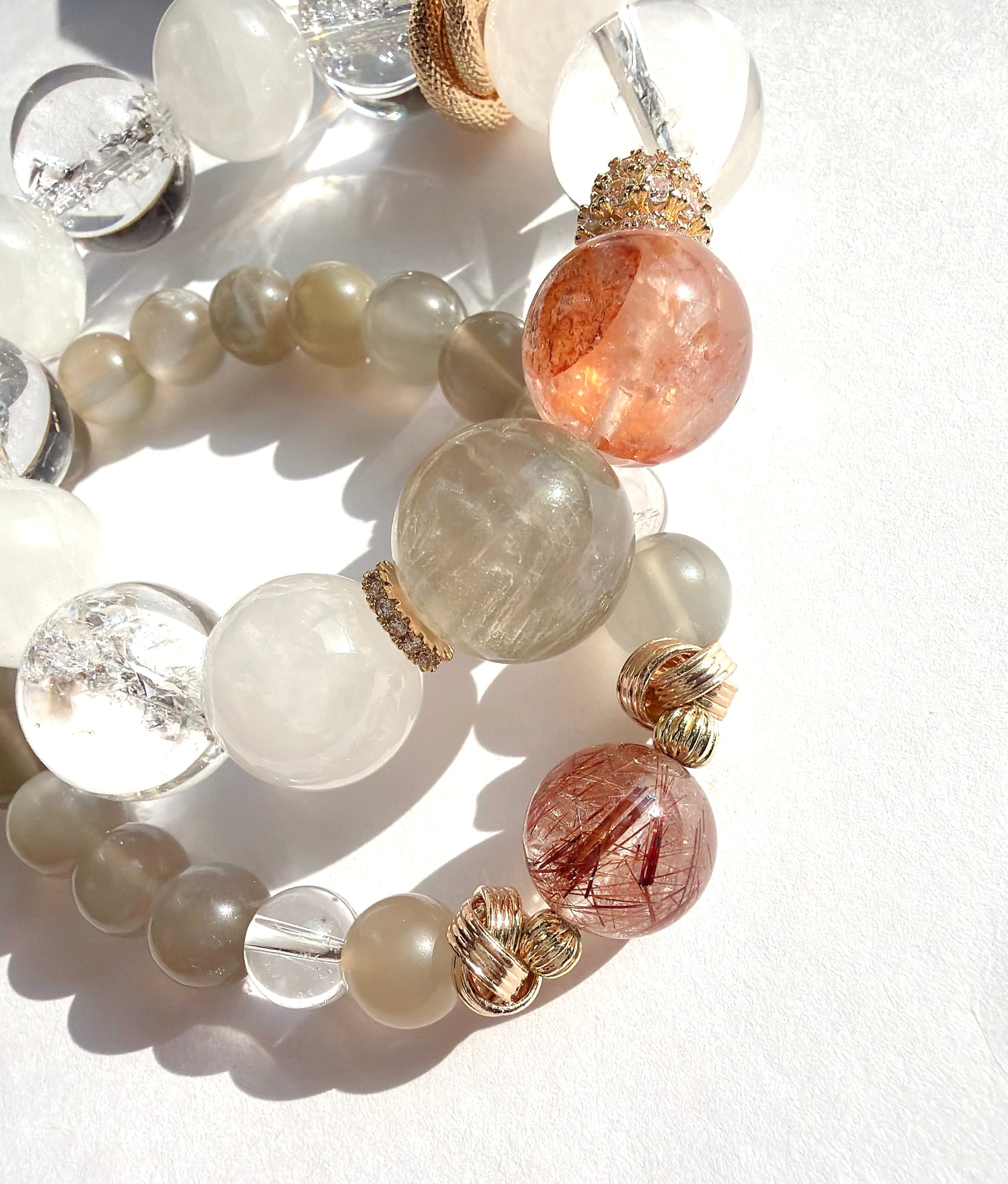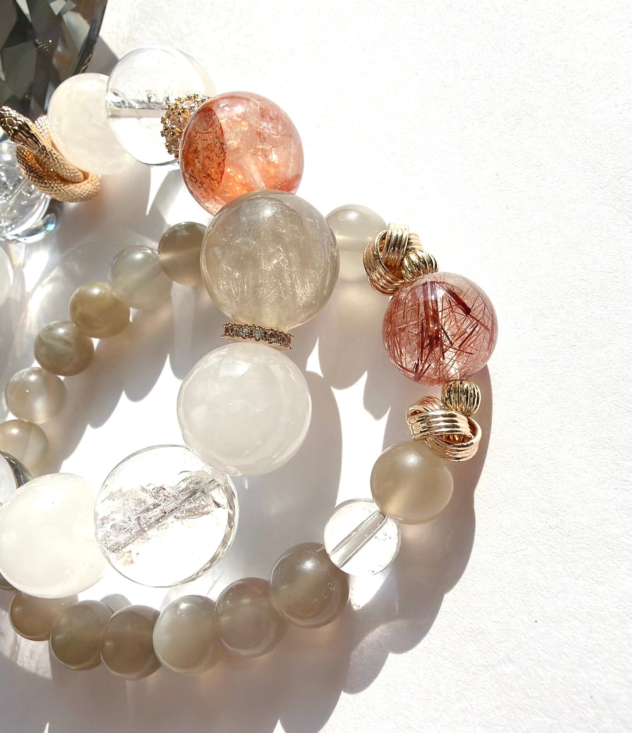 ライモナイトは、安定と成功を象徴するとされ、フローライトは心を整え、直感を高めてくれると言われています。また、レッドルチルラブラドライトは、強力なエネルギーをもたらし、ポジティブな変化を促す力を持つとされています。二連デザインはそのエレガントさを演出するだけでなく、高品質な天然石を使用している点も魅力。カジュアルな日常から特別なイベントまで、幅広くご活用いただけます。
