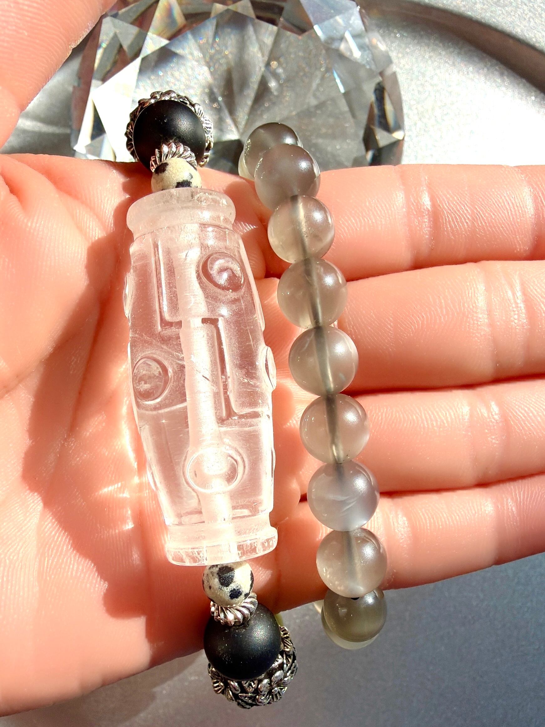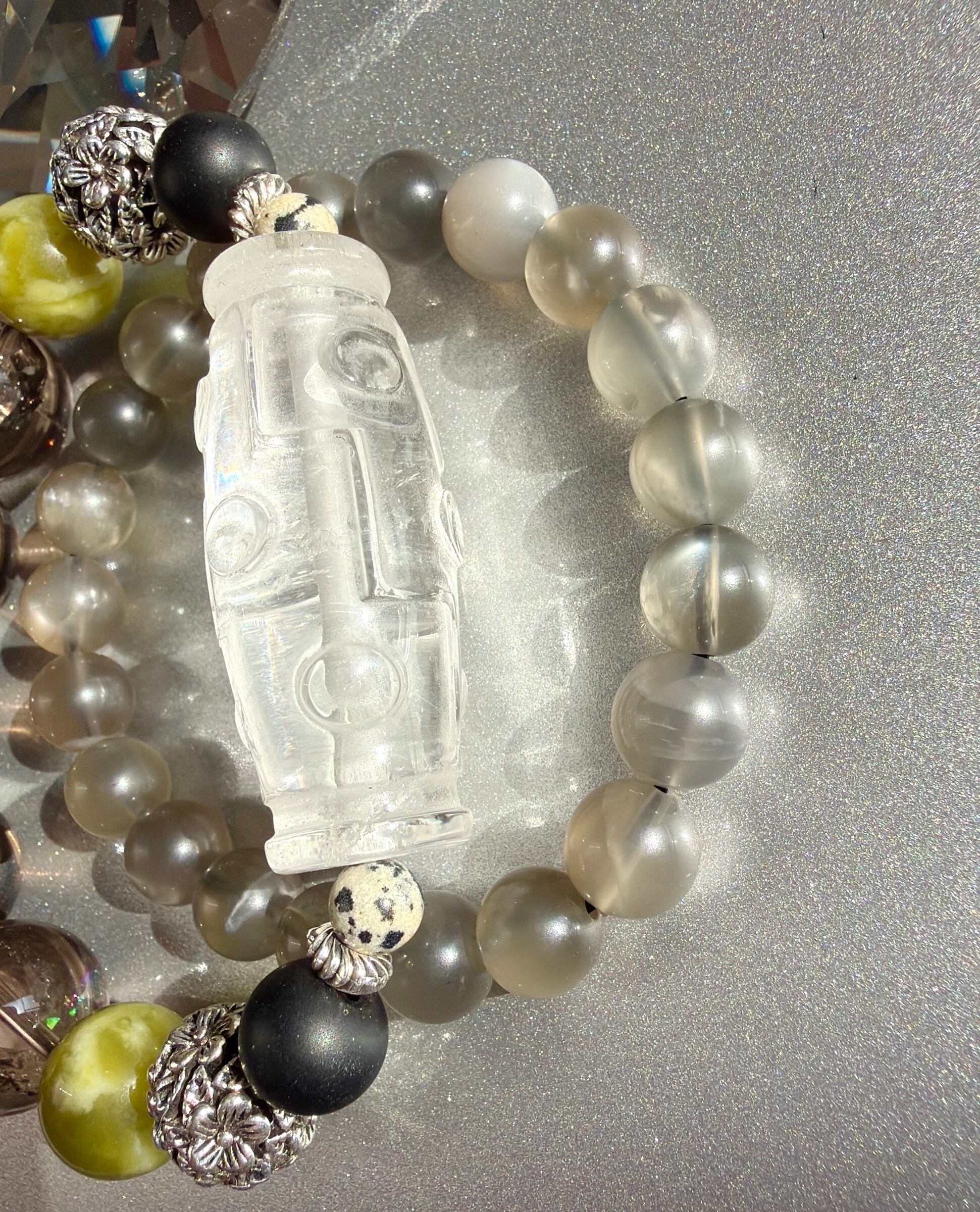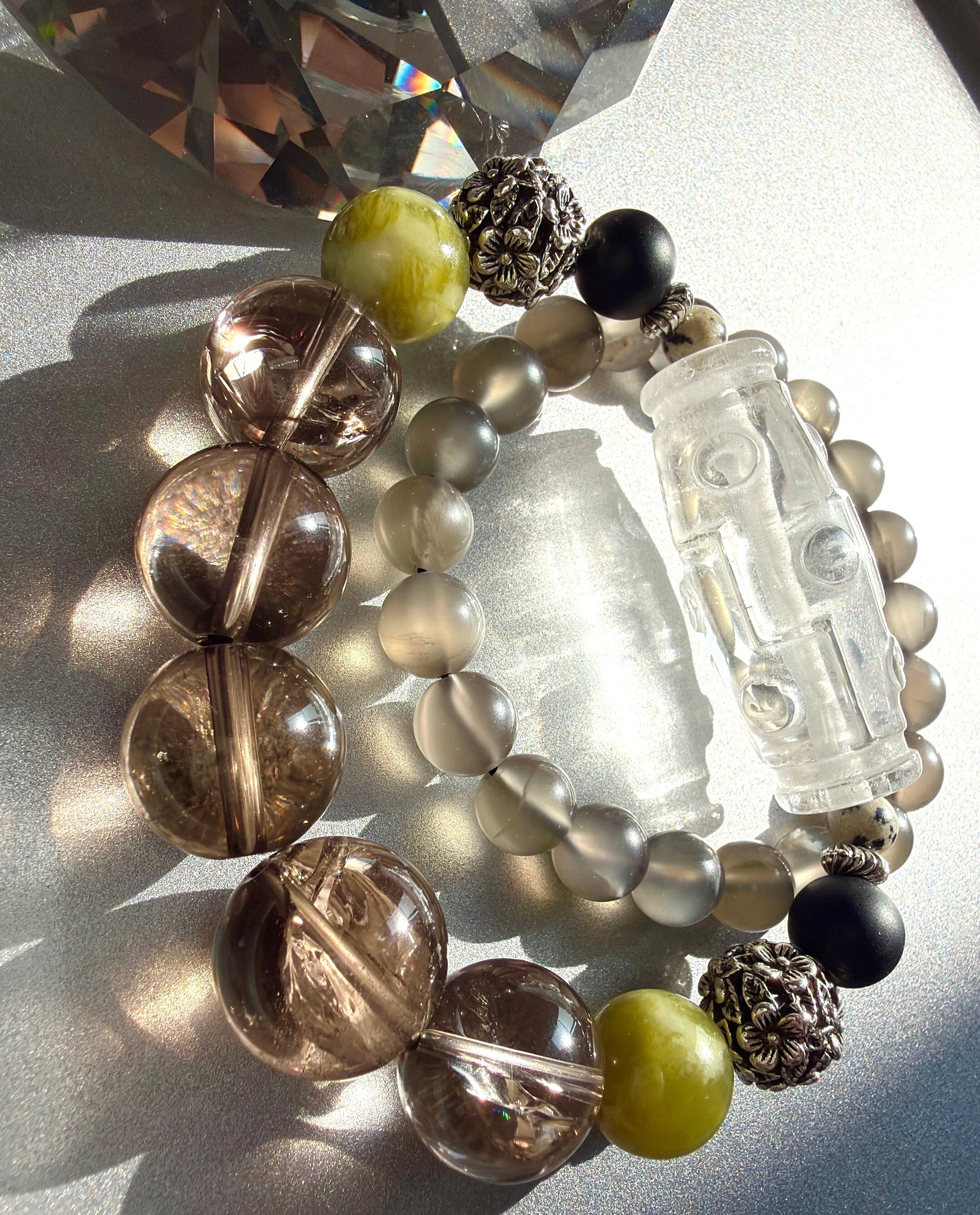 存在感あふれる九眼天珠と美しいアイリススモーキークォーツ、さらにはサーペンティンとグレームーンストーンを組み合わせたクールな二連タイプのブレスレットが登場しました!洗練されたデザインと高品質な天然石の魅力が融合し、あなたの手元をスタイリッシュに演出します。このブレスレットは、特別な日から日常まで幅広く楽しめる逸品です!