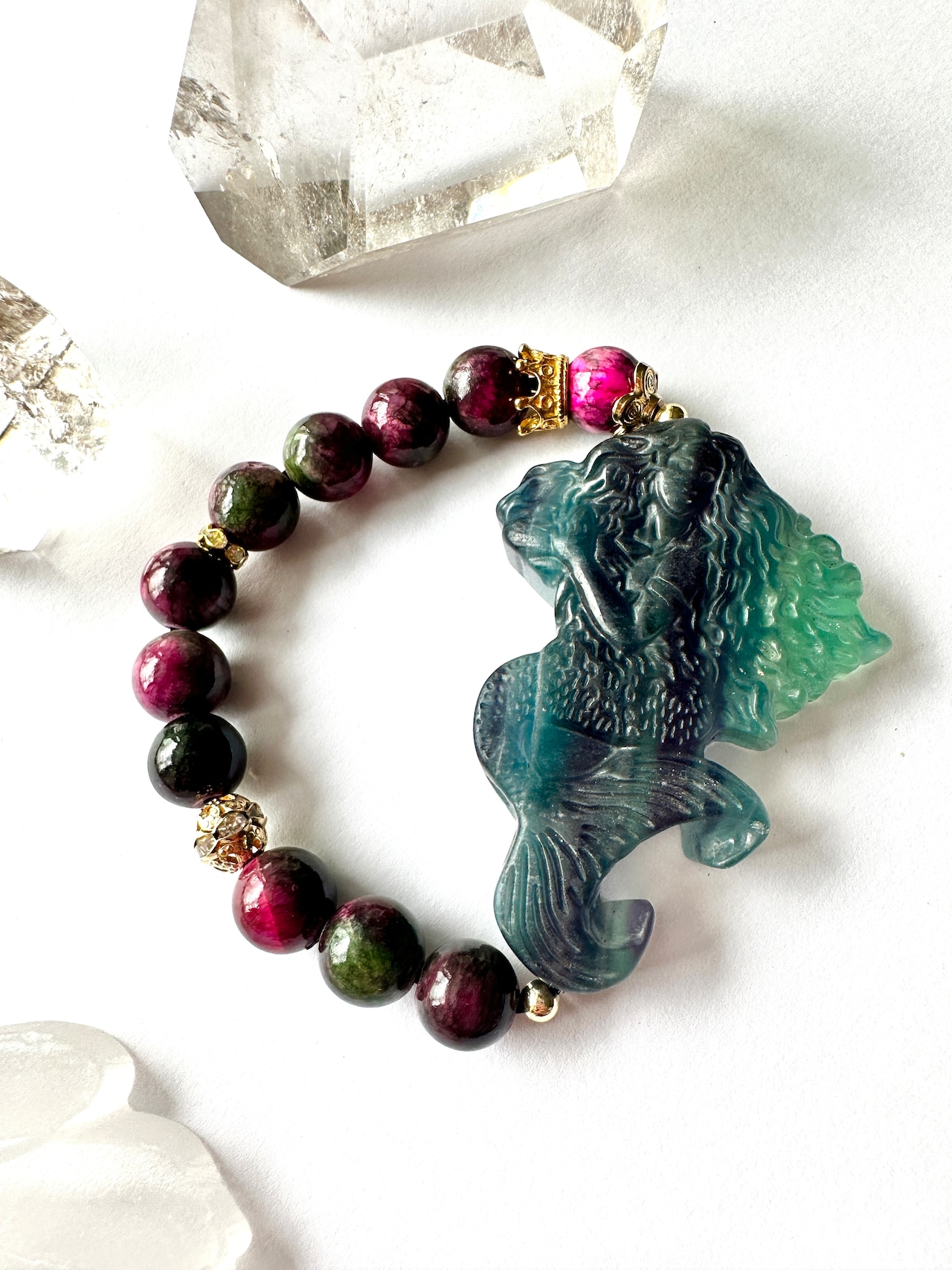 神秘的なオイスターコッパーターコイズと優雅なフローライトが組み合わさったこの天然石ブレスレットは、深い海の底をイメージした人魚のような美しさを持っています。