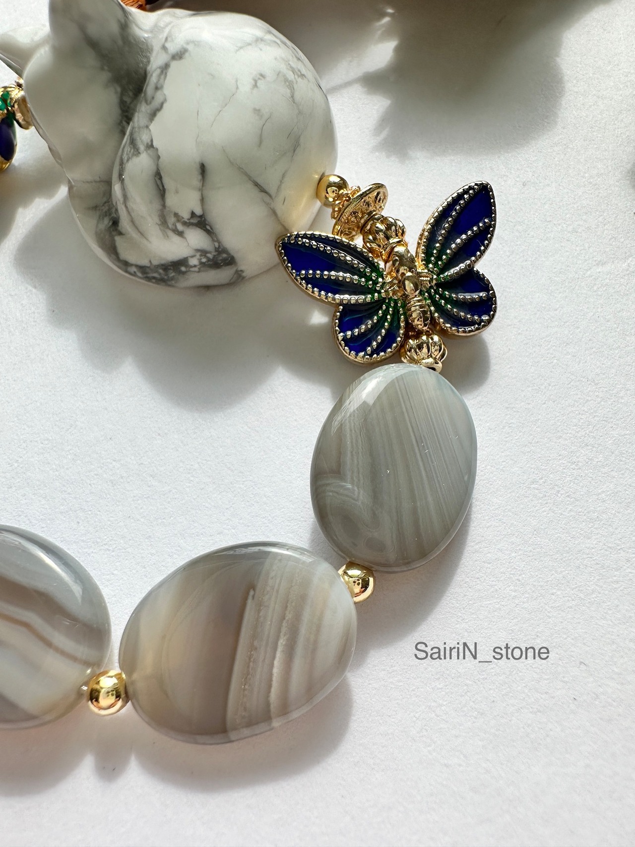 魅力的な天然石ブレスレットが新登場!楕円状の落ち着いたグレー色の瑪瑙に、可愛い猫とブルーの蝶々と鞠がアクセント。ハウライトの美しさに一目惚れすること間違いなし!
