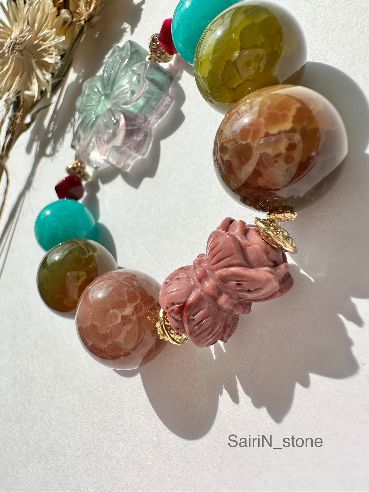 天然石ブレスレット:フローライト&アマゾナイト&ドラゴンアゲート&ピンクタイガーアイ&アラシャン。美しい天然石を集めて作られた花束のようなブレスレットです。アマゾナイトとドラゴンアゲートの組み合わせで、心身のバランスを整え、癒しの力を与えます。フローライトの花が上品なアクセントになり、ピンクタイガーアイがエレガントな輝きを添えます。また、アラシャンが花束を優しく包み込み、愛と幸福を運んでくれるでしょう。自然の力を感じながら、日常の中に幸せを見つけましょう。