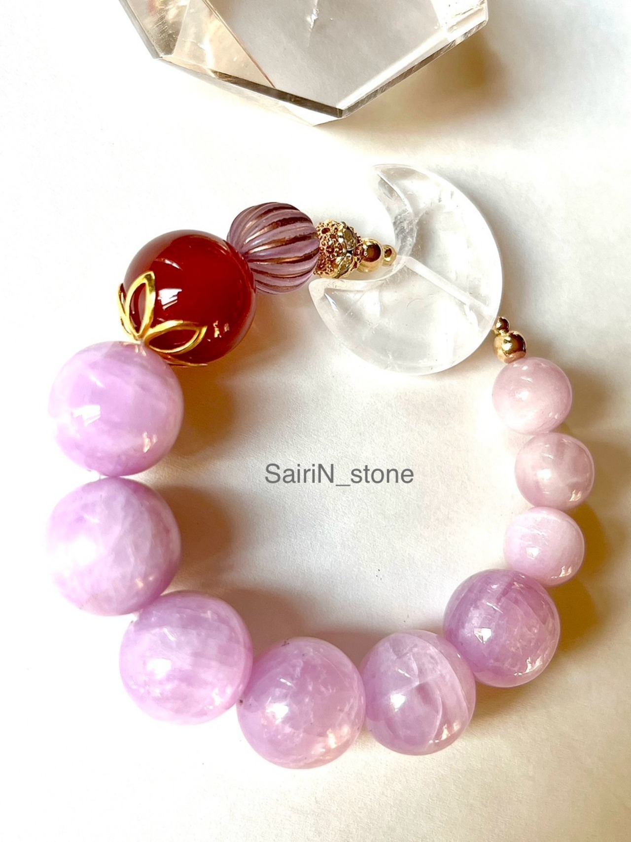 透明感あふれる美しいクンツァイトと、情熱的な赤色が魅力のレッドアゲート、そして月の水晶が織りなす天然石ブレスレット。とても女性らしくエレガントな一品です。