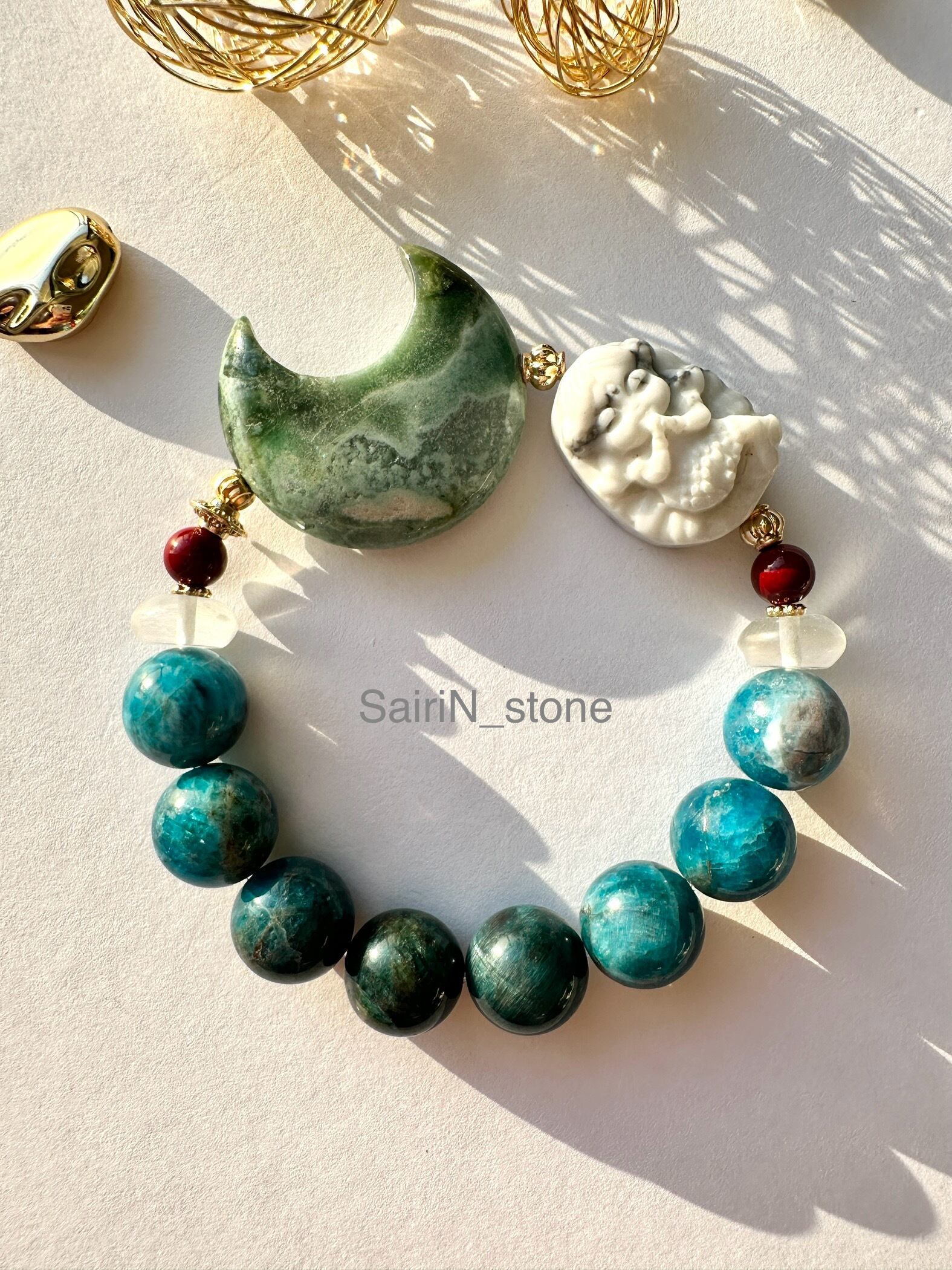 神秘的で美しい天然石ブレスレットのご紹介です。クリソコラと水晶、そしてモスアゲート。これらの貴重な石を組み合わせて、月とハウライトの人魚が美しいアクセントを添えた一点もののブレスレットです。