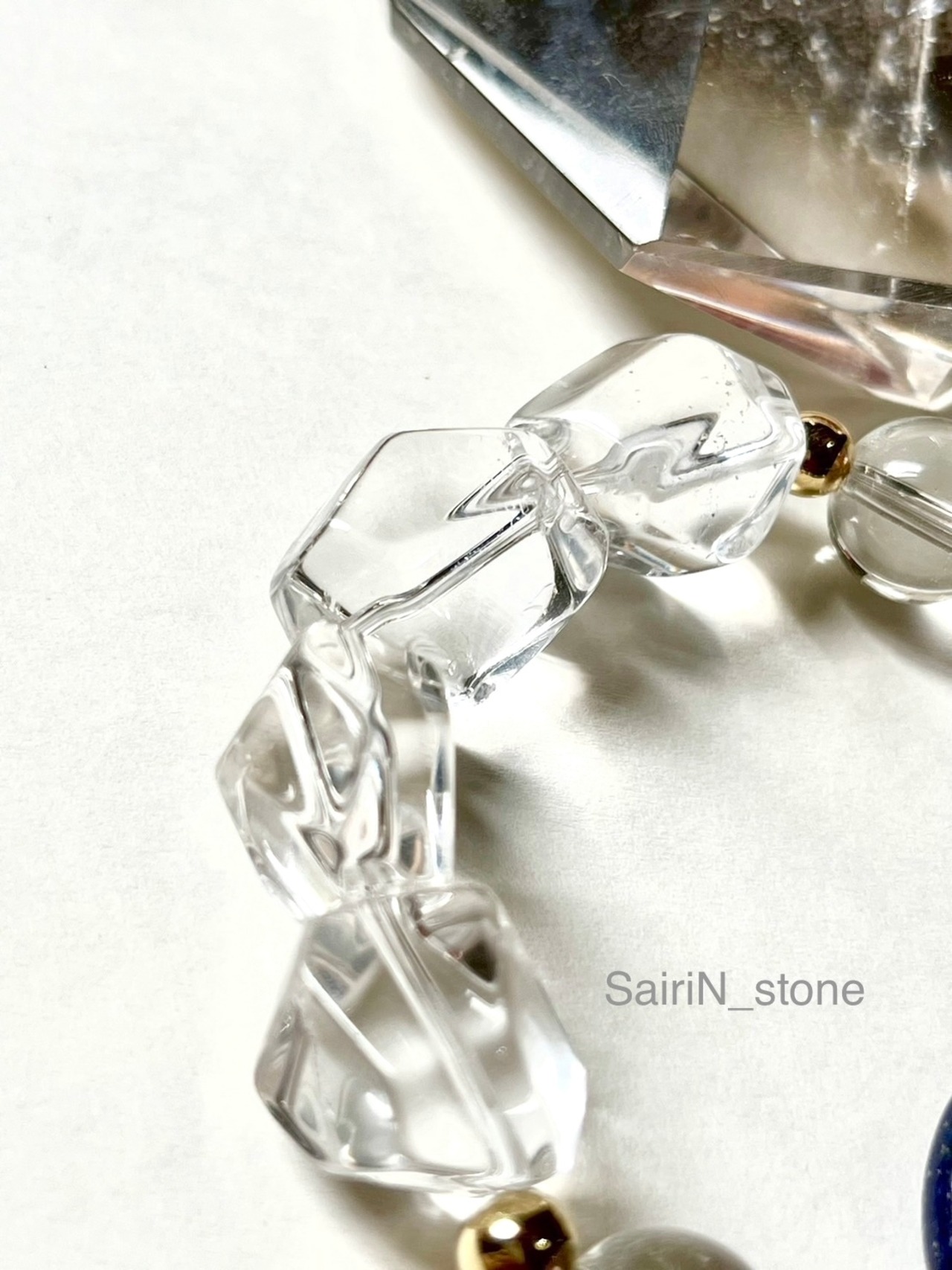 星空のような輝きを持つ天然石ブレスレット、ラピスラズリ&水晶&オイスターコッパーターコイズ&アバロン。まるで宇宙のような美しさを感じさせるこのブレスレットは、水晶とオイスターコッパーターコイズのブルーカラーに、ラピスラズリの月とアバロンシェルの星をあしらっています。その組み合わせは、非常に繊細でありながら、力強さも感じられるデザインです。