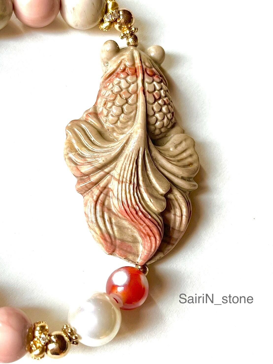 華やかで個性的な天然石ブレスレットです。金魚のパーツは、繊細な作りでありながらも存在感があり、アラシャンという天然石を使用しているので、艶やかな輝きが特徴です。さらに、アラシャンとオレンジアゲートを組み合わせることで、色彩にメリハリを与え、ブレスレット全体を引き立たせています。