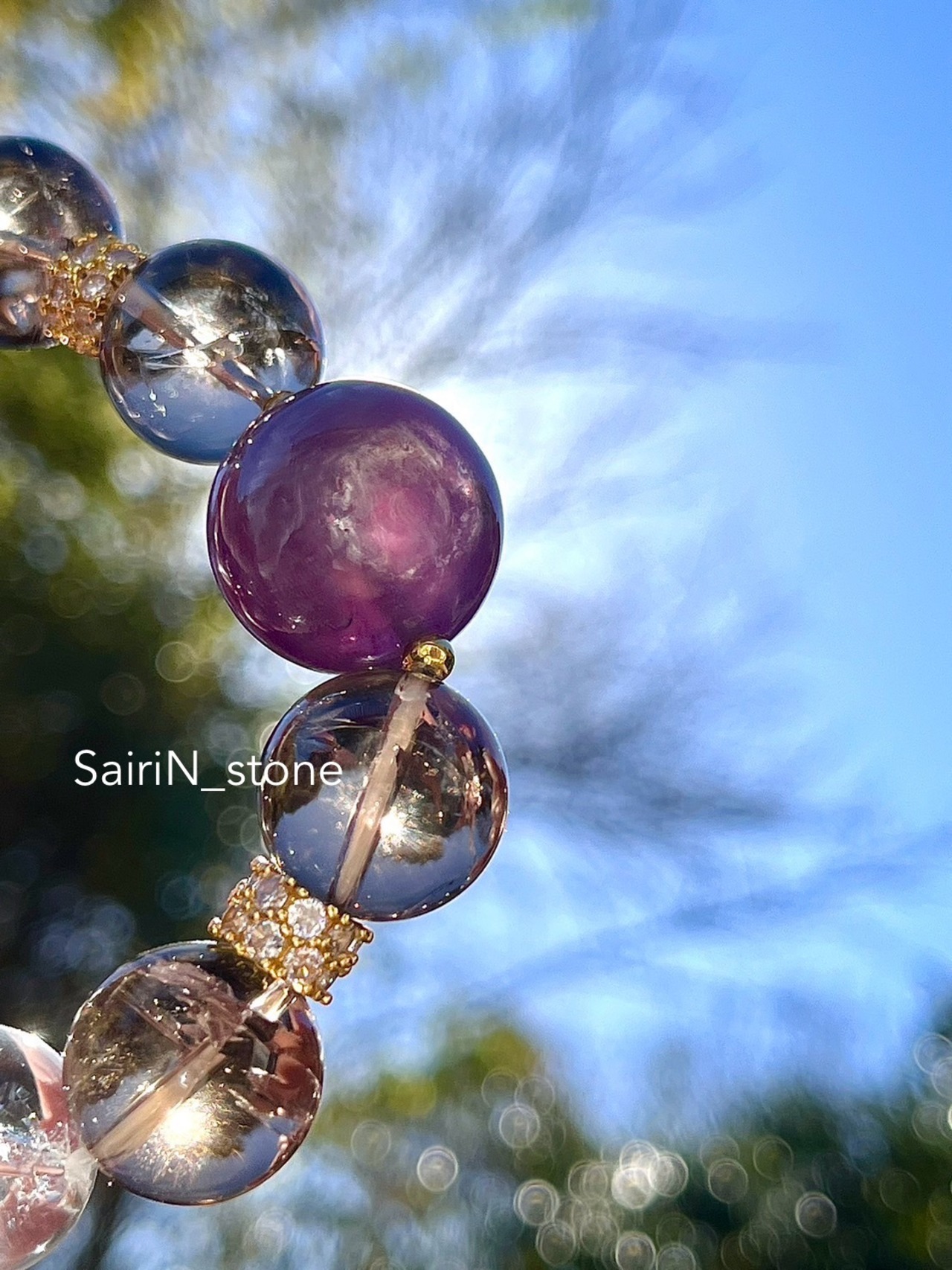 アイリススモーキーとアイリス水晶の中の光が綺麗なパープルマイカをより一層輝かせます。