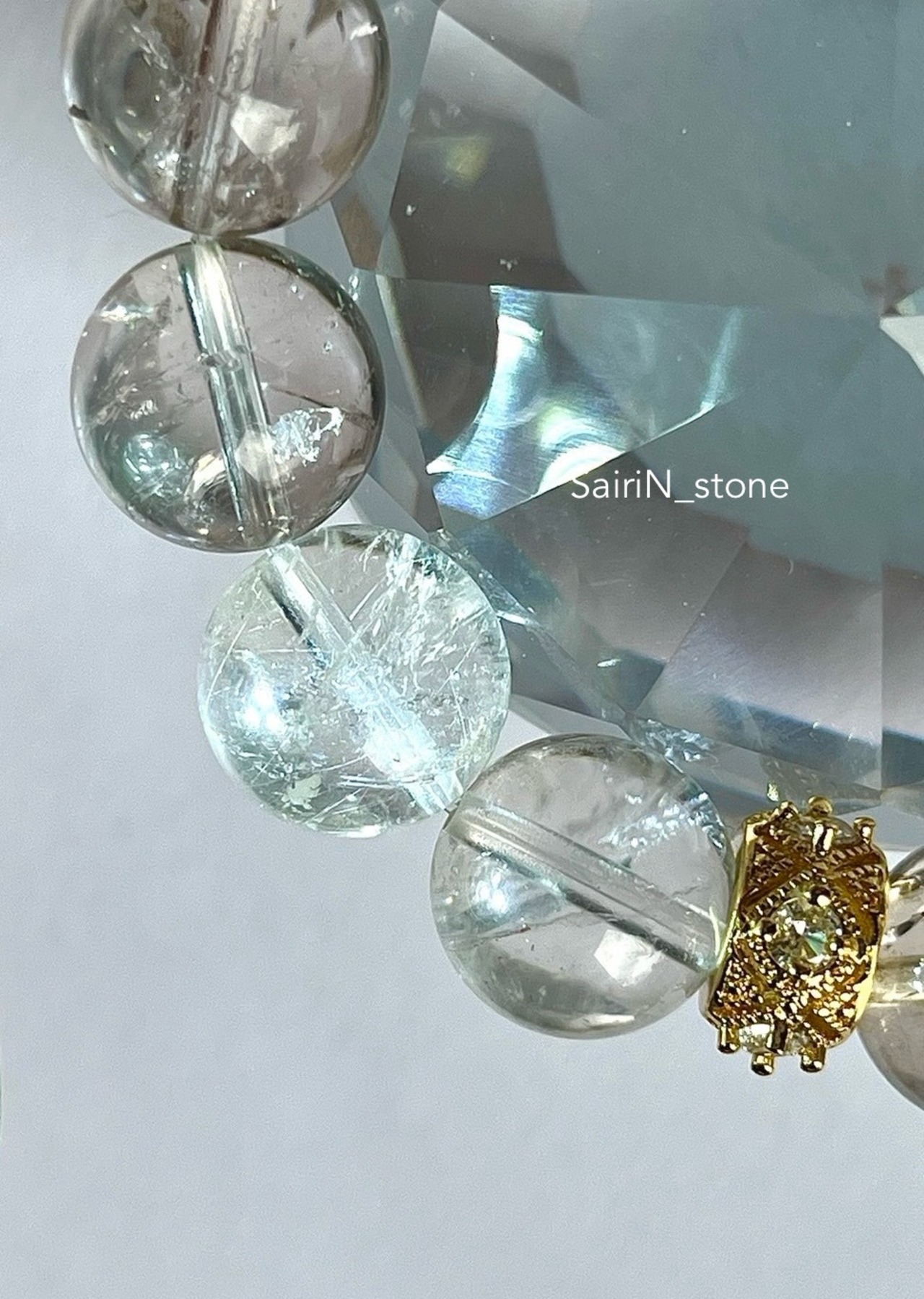 エレガントな天然石ブレスレットのご紹介です。グリーンエメラルドマイカとアイリスエレスチャルクォーツ、さらにシルバールチル入りのエレスチャルクォーツが絶妙に組み合わさり、美しい輝きを放ちます。自然が生み出した美しさを身に纏うことで、日常に彩りと深みを加えることができるでしょう。