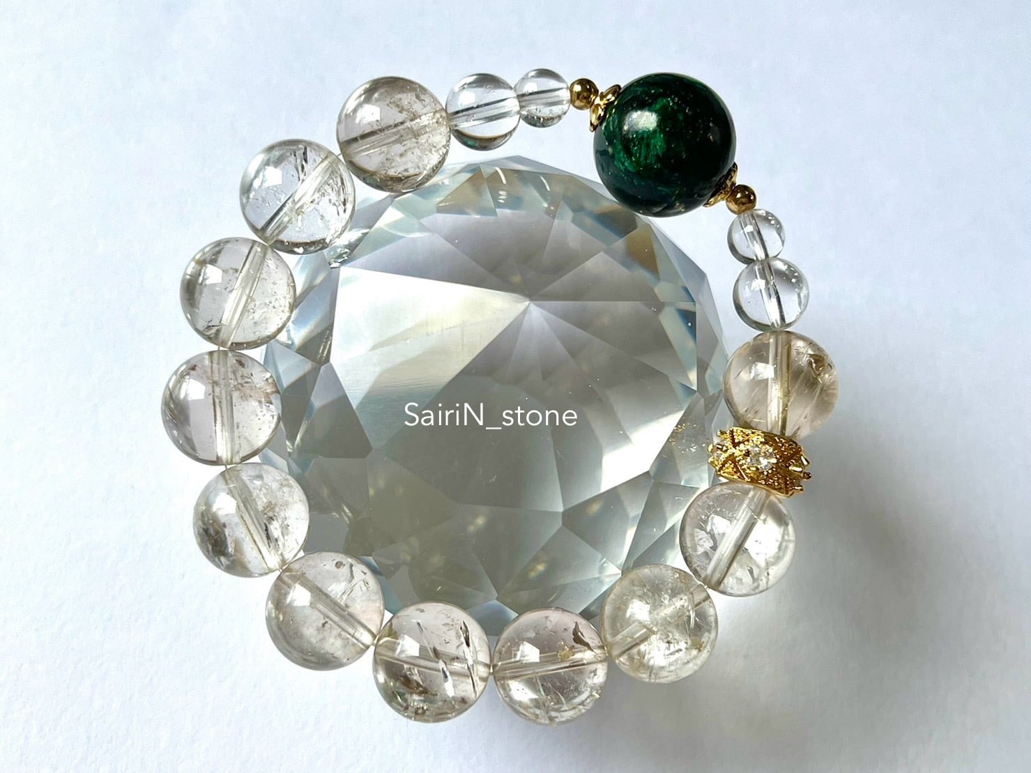 天然石 ブレスレット グリーンエメラルドマイカ アイリスエレスチャルクォーツ 水晶 エレスチャルクォーツ シルバールチル入り