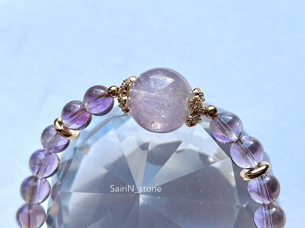 美しい天然石を使用したアメトリンとラベンダーアメジストのブレスレットです。アメトリンは、アメシストとシトリンの2つの鉱物が結晶化したものであり、その色彩の美しさはまさに優雅さを感じさせるものです。一方、ラベンダーアメジストは淡い紫色の透明感があり、心の安定や癒しをもたらすとされています。