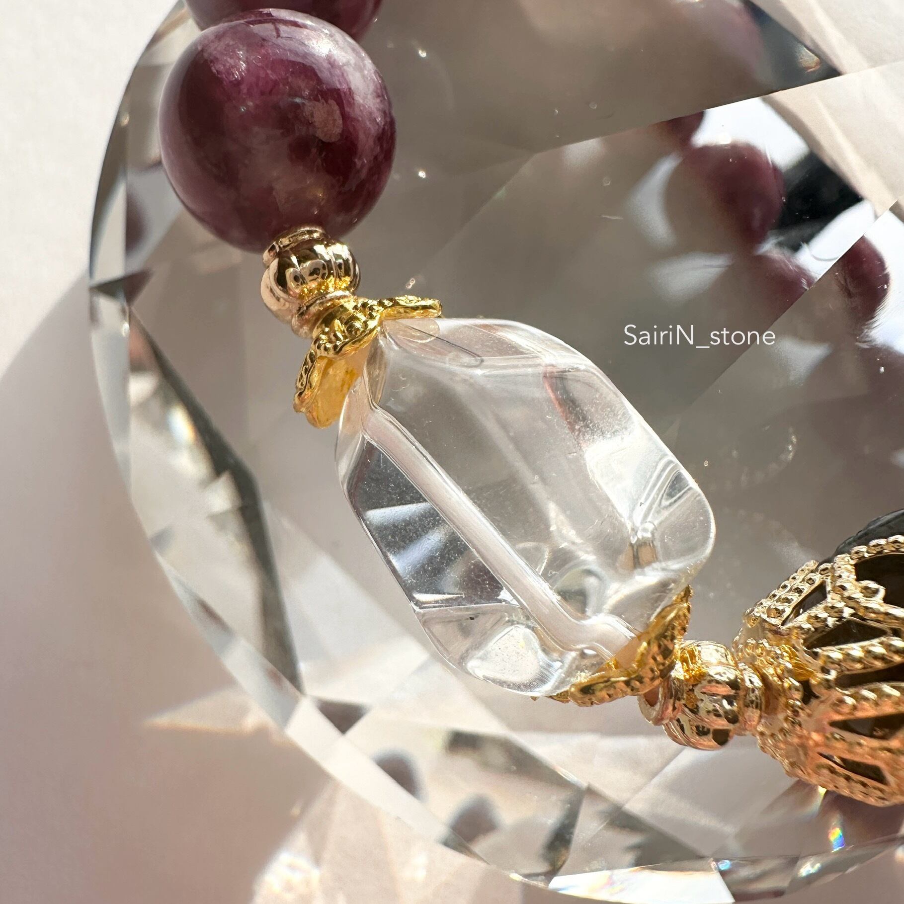 神秘的で美しい天然石のブレスレットです。ラブラドライト、パープルマイカ、水晶の組み合わせが魅力です。美しく輝くシラー効果があるラブラドライトは、パープルマイカと水晶との相性も抜群です。このブレスレットは、エネルギーを高め、心身のバランスを整えると言われています。天然石の力により、ストレスやネガティブな感情を癒し、ポジティブなエネルギーを引き寄せるサポートをしてくれます。また、ウェアラブルなアクセサリーとして、ファッションのポイントにもなります。是非、この天然石のブレスレットで、身につけることで、あなたの日常に癒しと幸福感をもたらすことをお約束いたします。