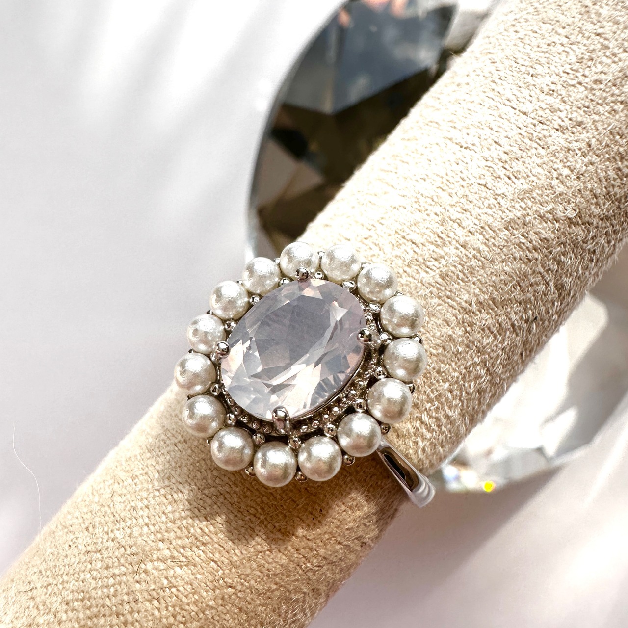 さりげない輝きを放つこの指輪は、特別な日の装いにもぴったり。大切な人への贈り物としても喜ばれること間違いなしです。自分へのご褒美にもおすすめです。ラグジュアリー感と優雅さを兼ね備えた、ラベンダーアメジストとパールの指輪を是非お試しください。