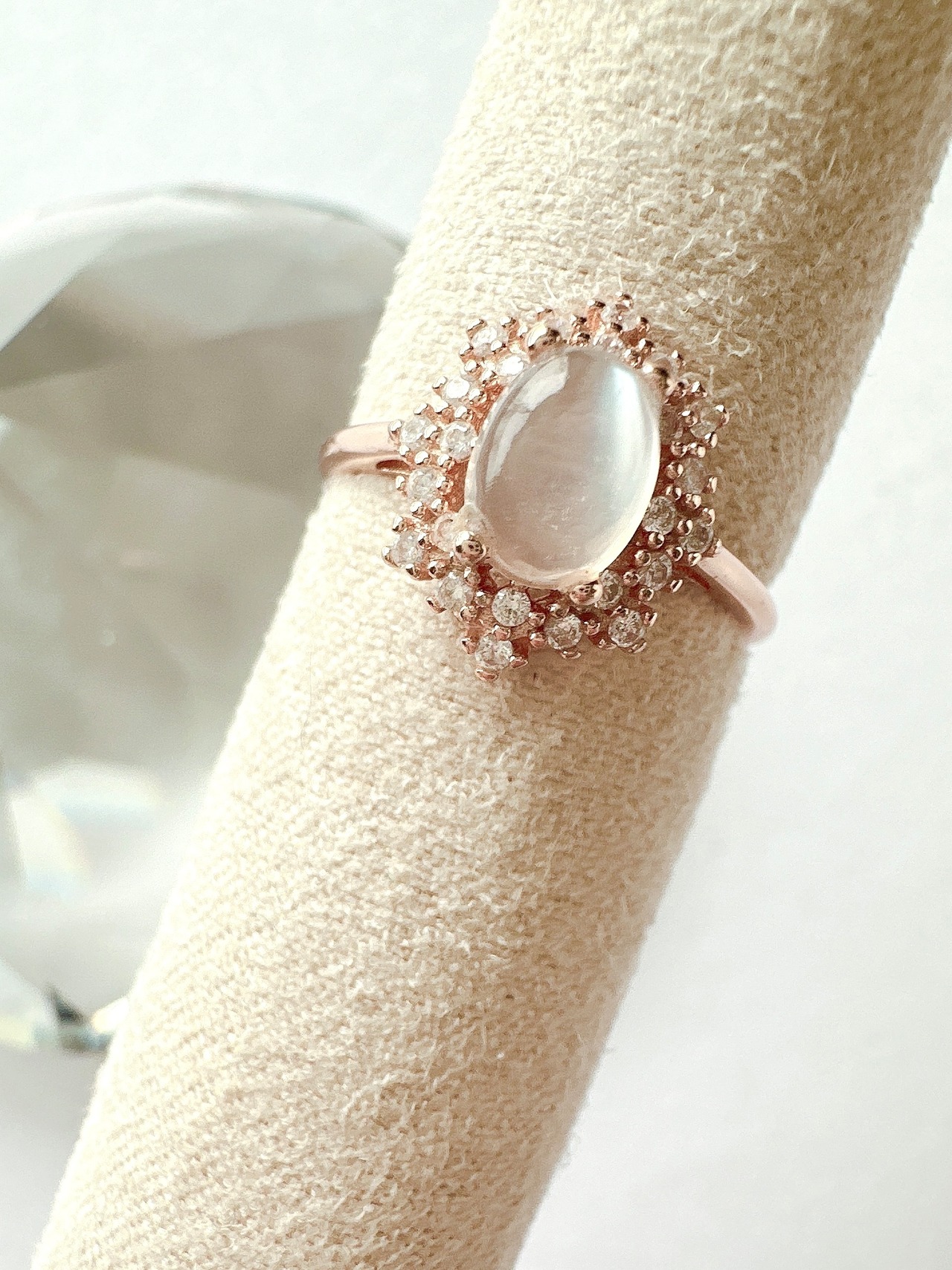 美しい輝きを放つムーンストーンと上質なピンクゴールドが調和した、上品でゴージャスな指輪が新登場しました。指元を繊細に彩り、女性らしさを引き立てる、エレガントなデザインです。特別な日の装いにも、普段使いにも相応しいアイテムです。