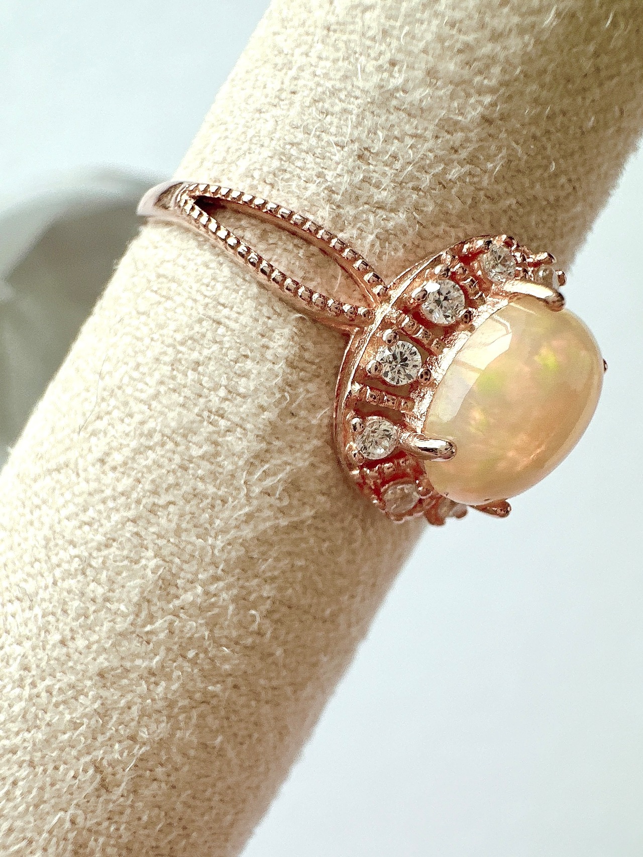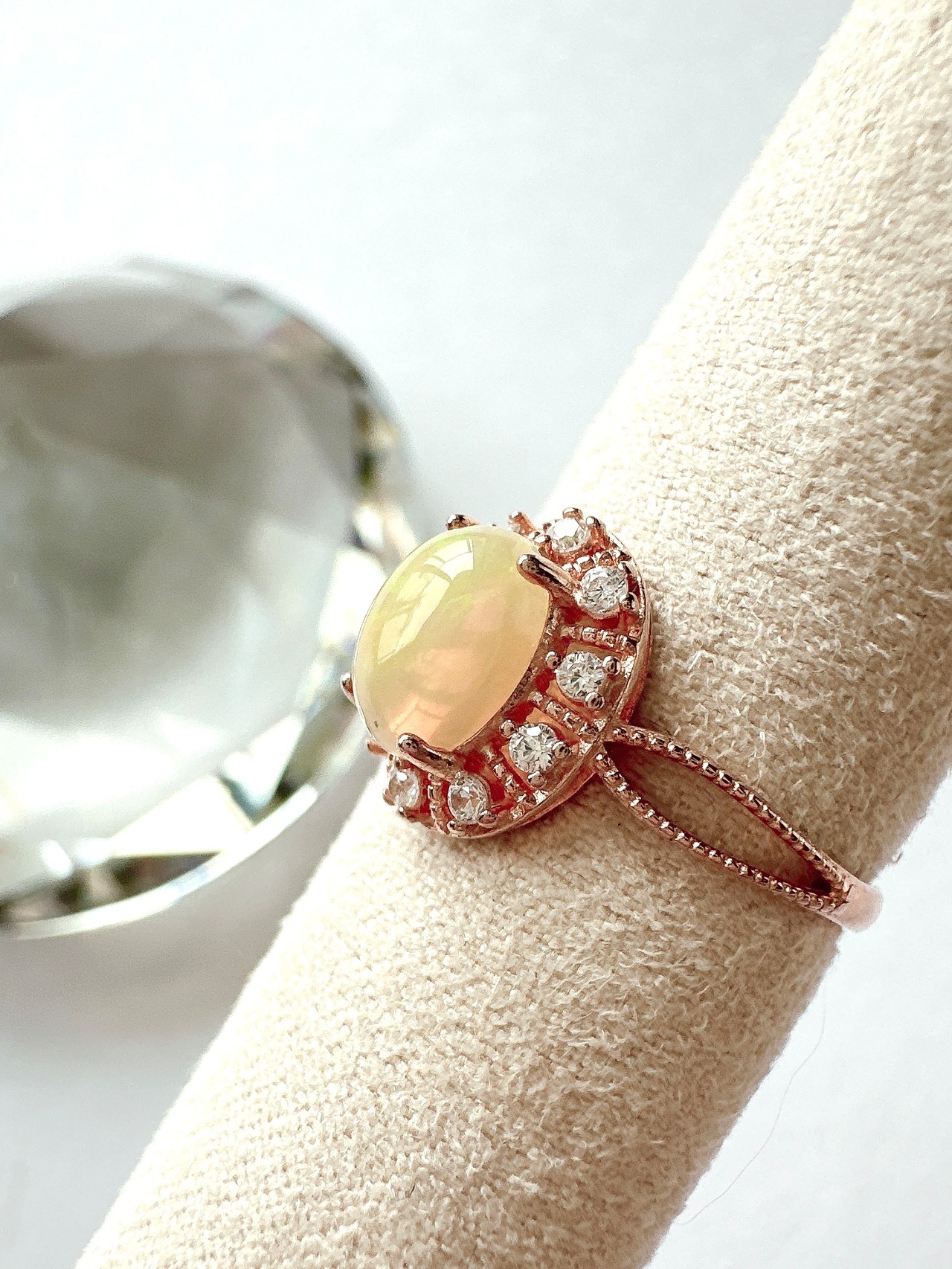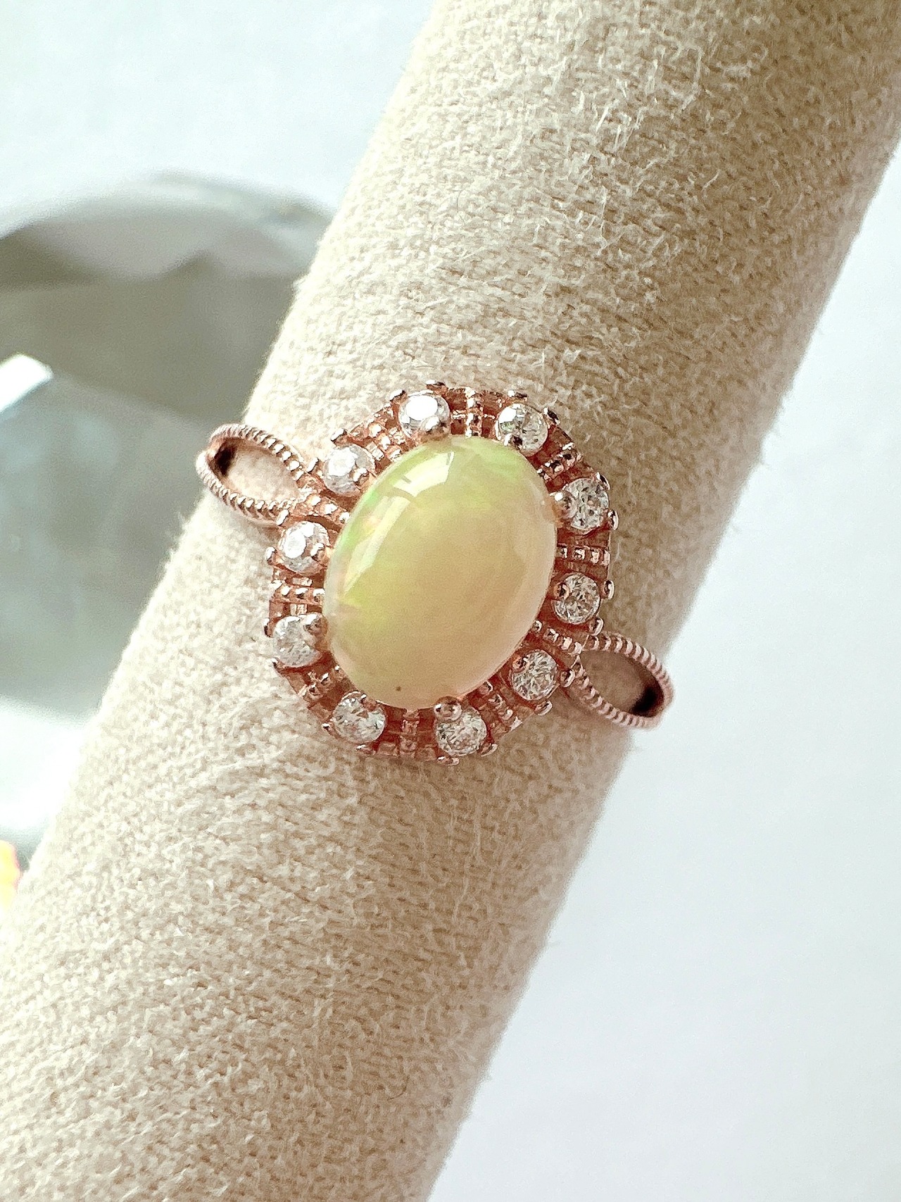 上質なピンクゴールドと美しいオパールが輝く、エレガントな指輪です。オパール特有の内包物が煌めくライトショーを楽しめる一品。指元を華やかに彩り、日常の中にちょっとした贅沢感をプラスします。シンプルなデザインなので、どんなコーディネートにも合わせやすく、幅広いシーンで活躍します。