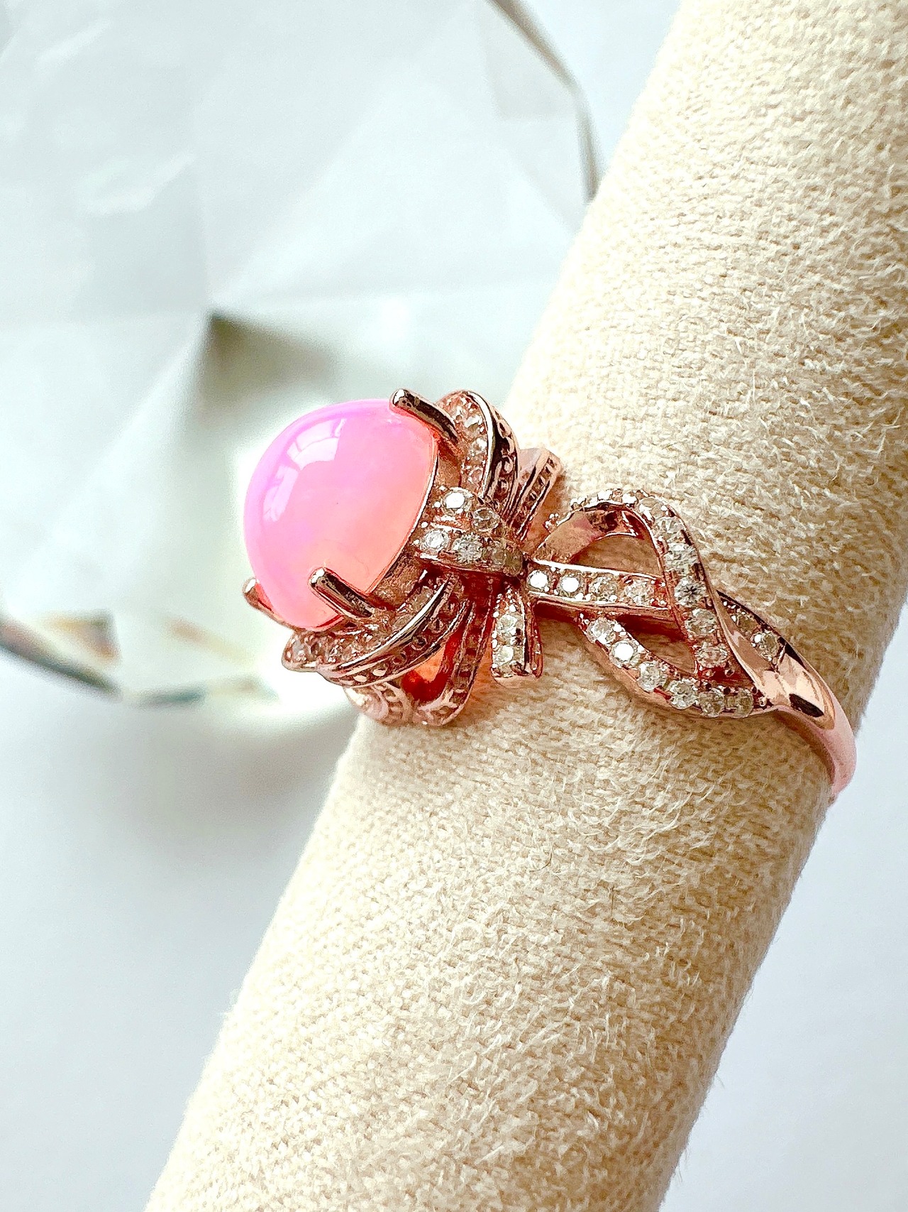 華やかな輝きを放つアクセサリー、ピンクオパール指輪。ピンクゴールドの台座が際立ち、優雅な雰囲気を演出します。指輪の中心には、幻想的なピンクオパールが輝きを添え、華やかさを一層引き立てます。シンプルながらも高級感漂うデザインは、どんなコーディネートにも相性抜群です。
