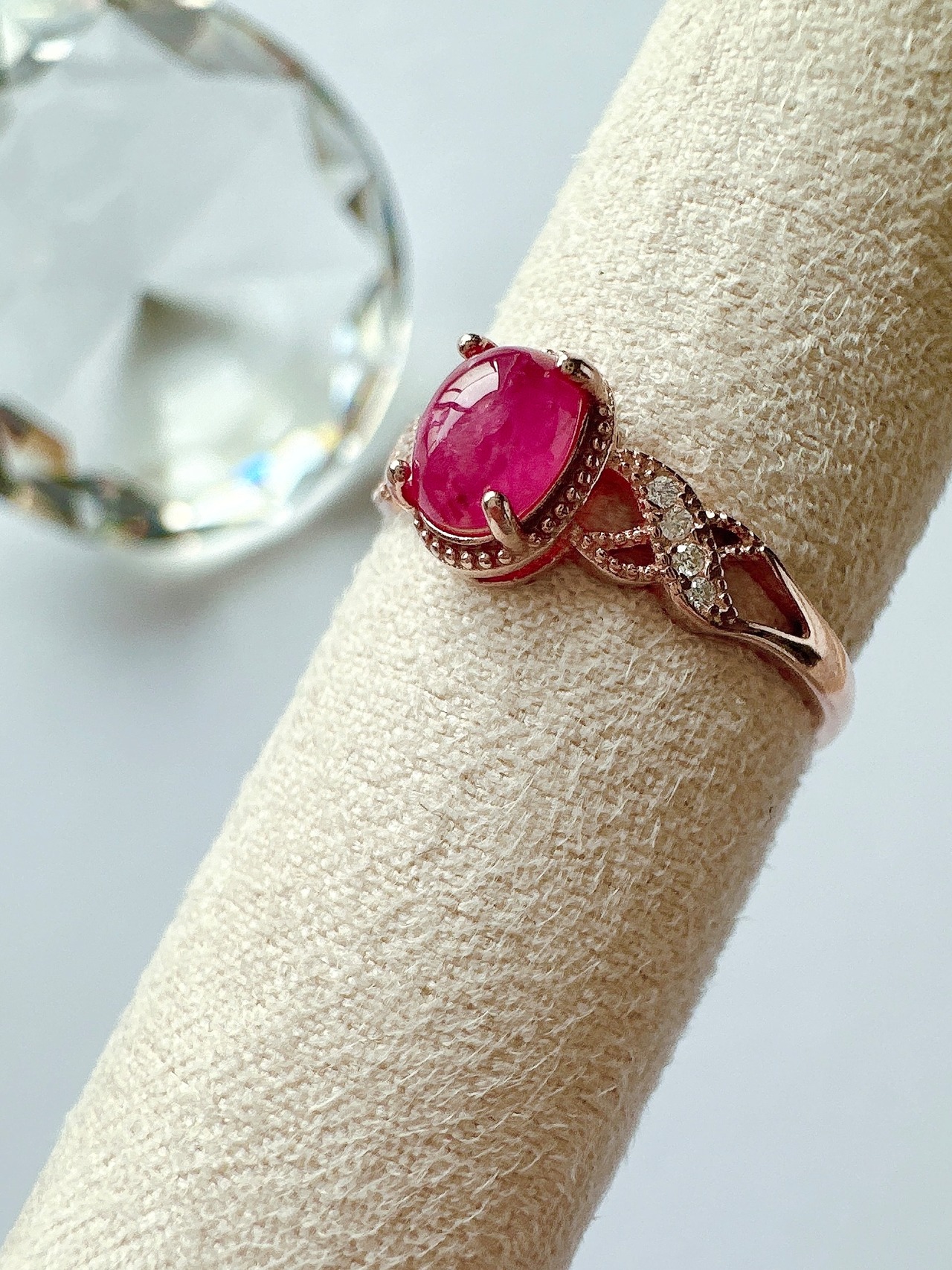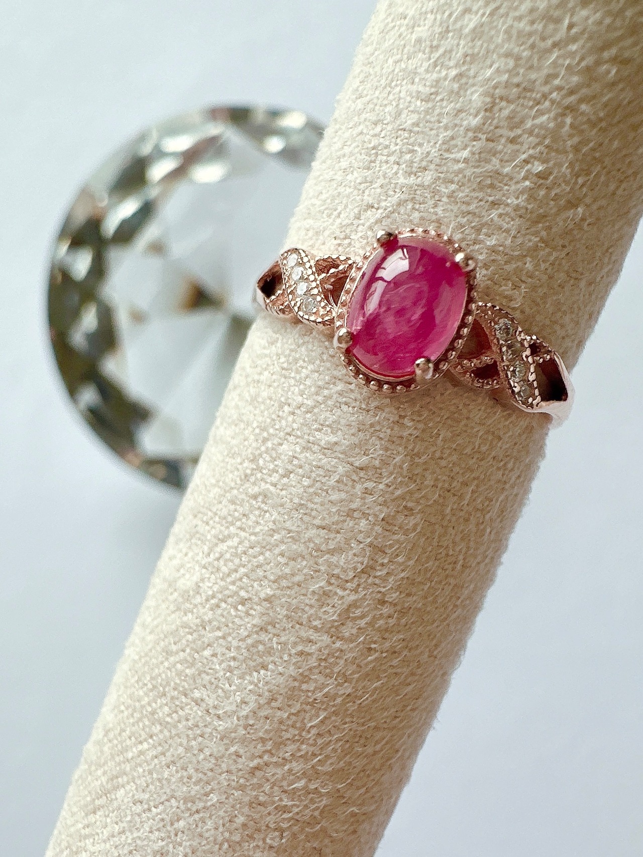 ピンクゴールドに輝く可愛らしいルビーの指輪です。S925の純銀製で、上品な仕上がりが魅力。ルビーの輝きが指先で華やかな印象を演出し、どんなコーディネートにも相性抜群です。特別な日のアクセントにも、普段使いにもおすすめです。