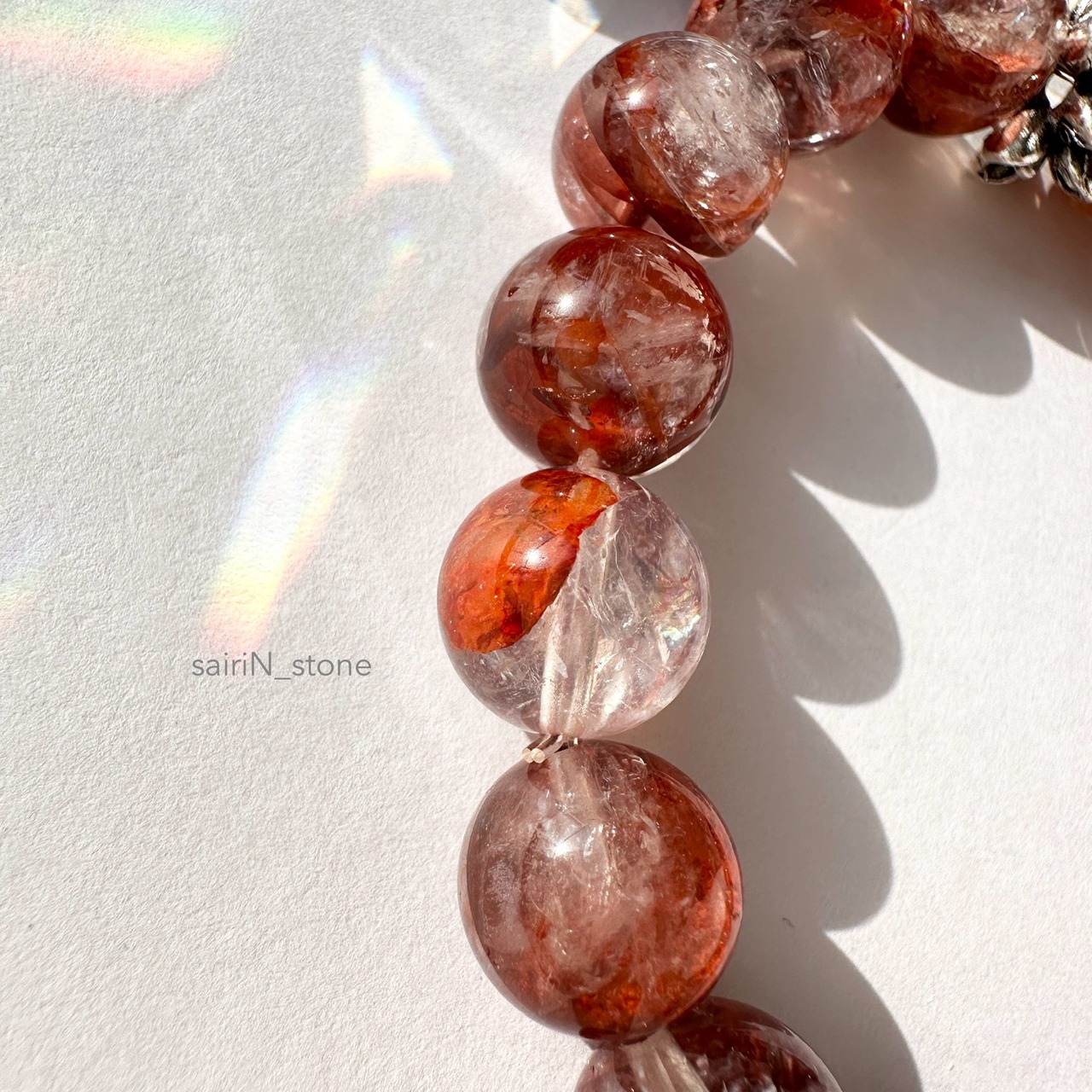 この天然石ブレスレットは、ファイヤークォーツとルチルクォーツの組み合わせが特徴。ファイヤークォーツは太陽をイメージさせる赤い色合いで、ポジティブなエネルギーを引き寄せるとされる石です。一方のルチルクォーツは、金針状の結晶が中に入り込んだ石で、豊かな発展や繁栄を象徴しています。