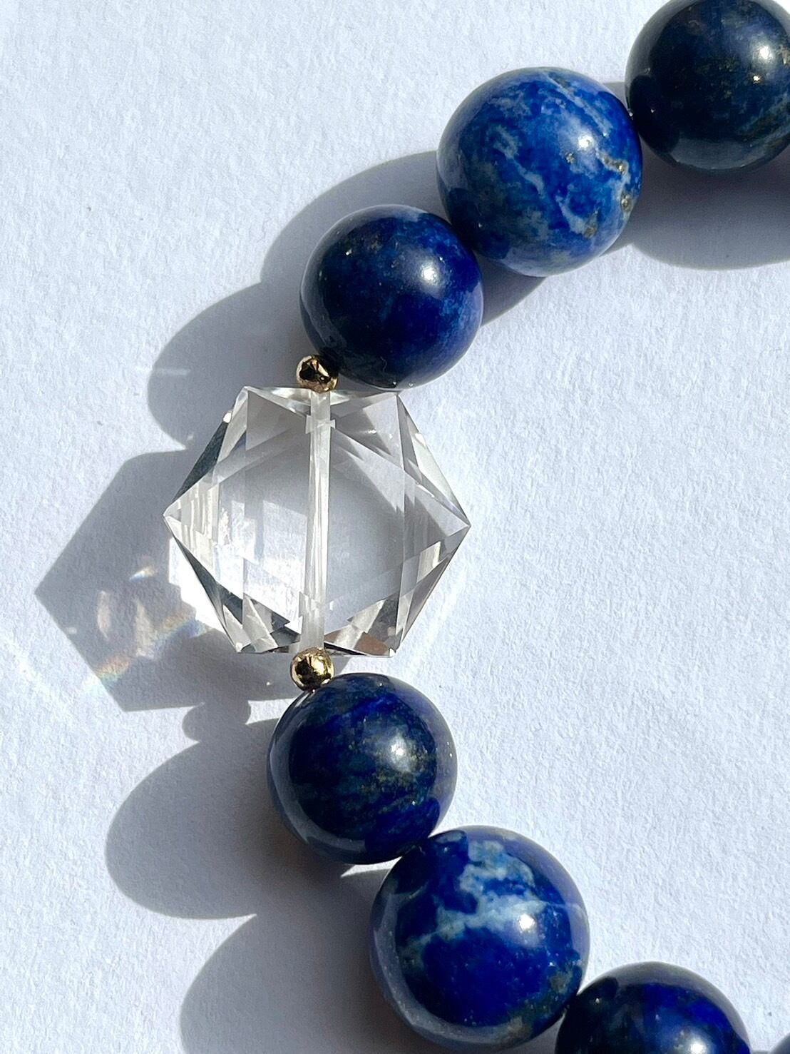 ラピスラズリ、ソーダライト、水晶という3つの天然石を繋げたブレスレット。ラピスラズリは古代より知恵と愛情を象徴する石とされ、ソーダライトは平和と調和をもたらすと信じられています。水晶の六芒星はパワーとバランスを与えてくれるとされ、天使は癒しと導きをもたらす存在。それぞれの石が持つ特性が組み合わさったこのブレスレットは、日常生活に安心感とエネルギーを与えてくれるでしょう。