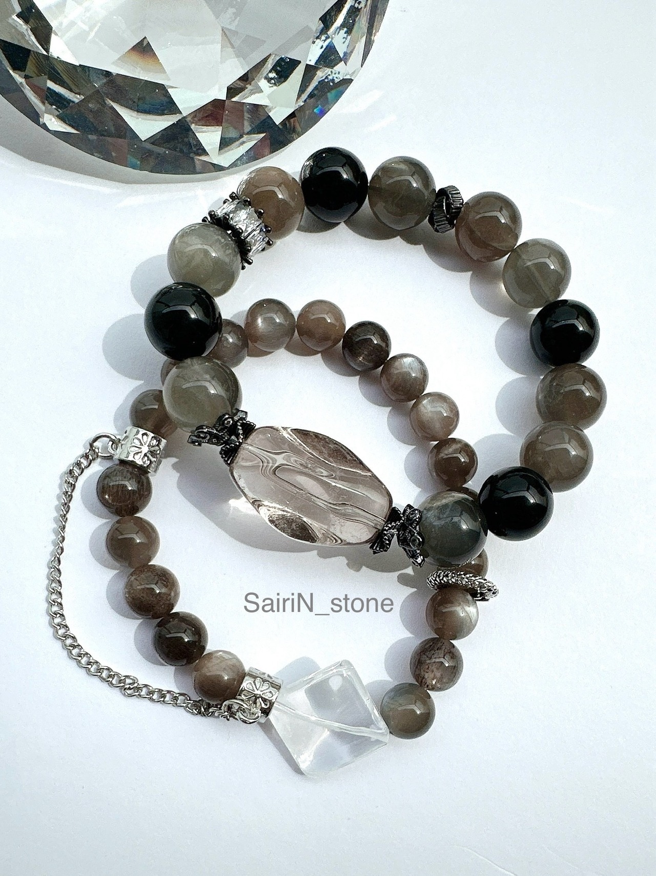 sold out!天然石 ブレスレット グレームーンストーン スモーキークォーツ 水晶 2連