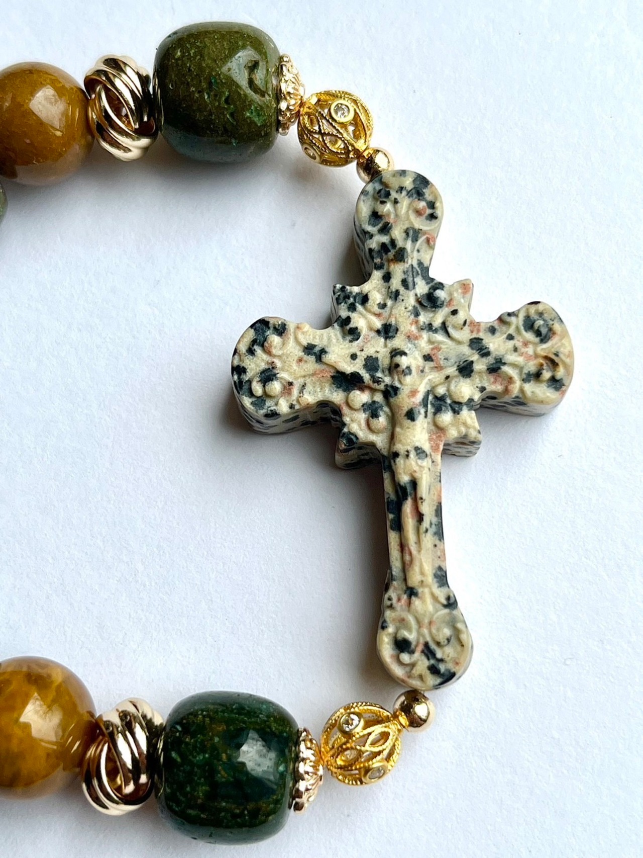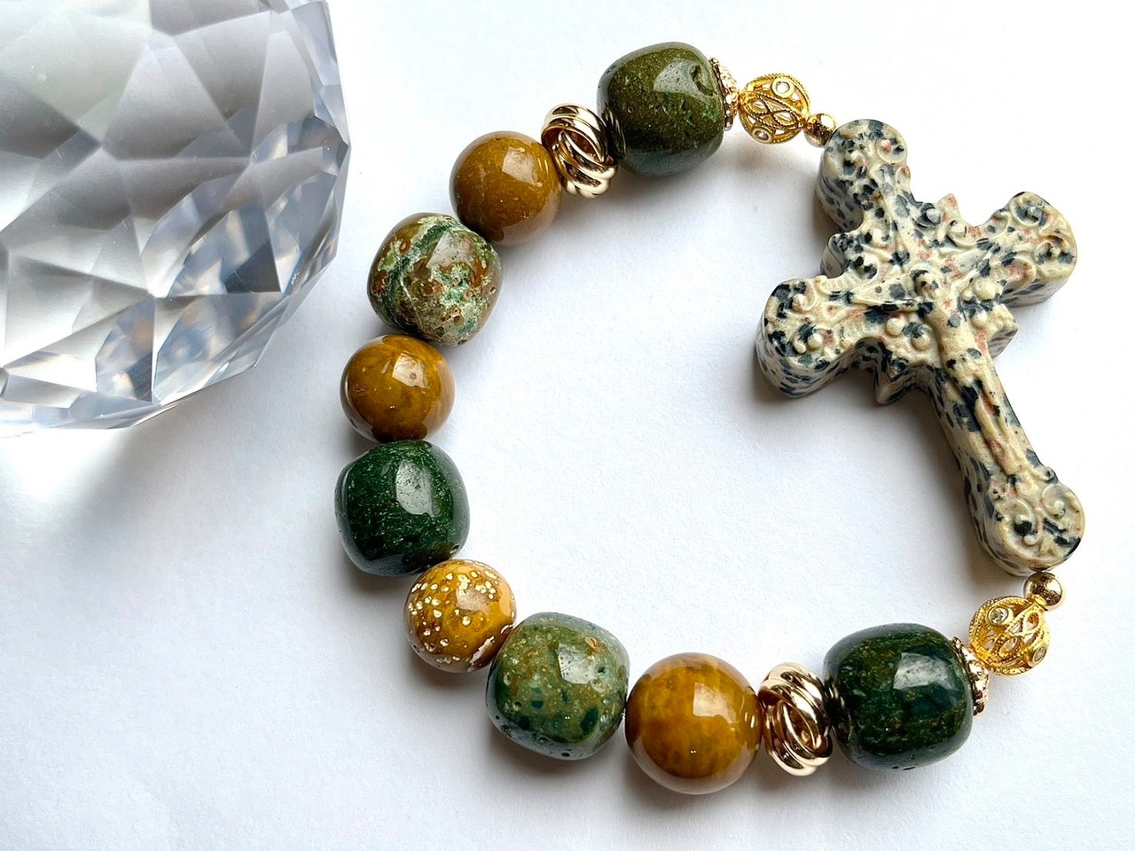 天然石のパワーを身に纏い、心に平安をもたらすブレスレットです。ダルメシアンジャスパーの十字架には、幸運を引き寄せる力があります。オーシャンジャスパーやムーンストーンもそれぞれのパワーを持ち、あなたの魂を癒し、内なる美しさを引き出します。どんなコーディネートにも馴染み、日常のアクセントとして活躍します。