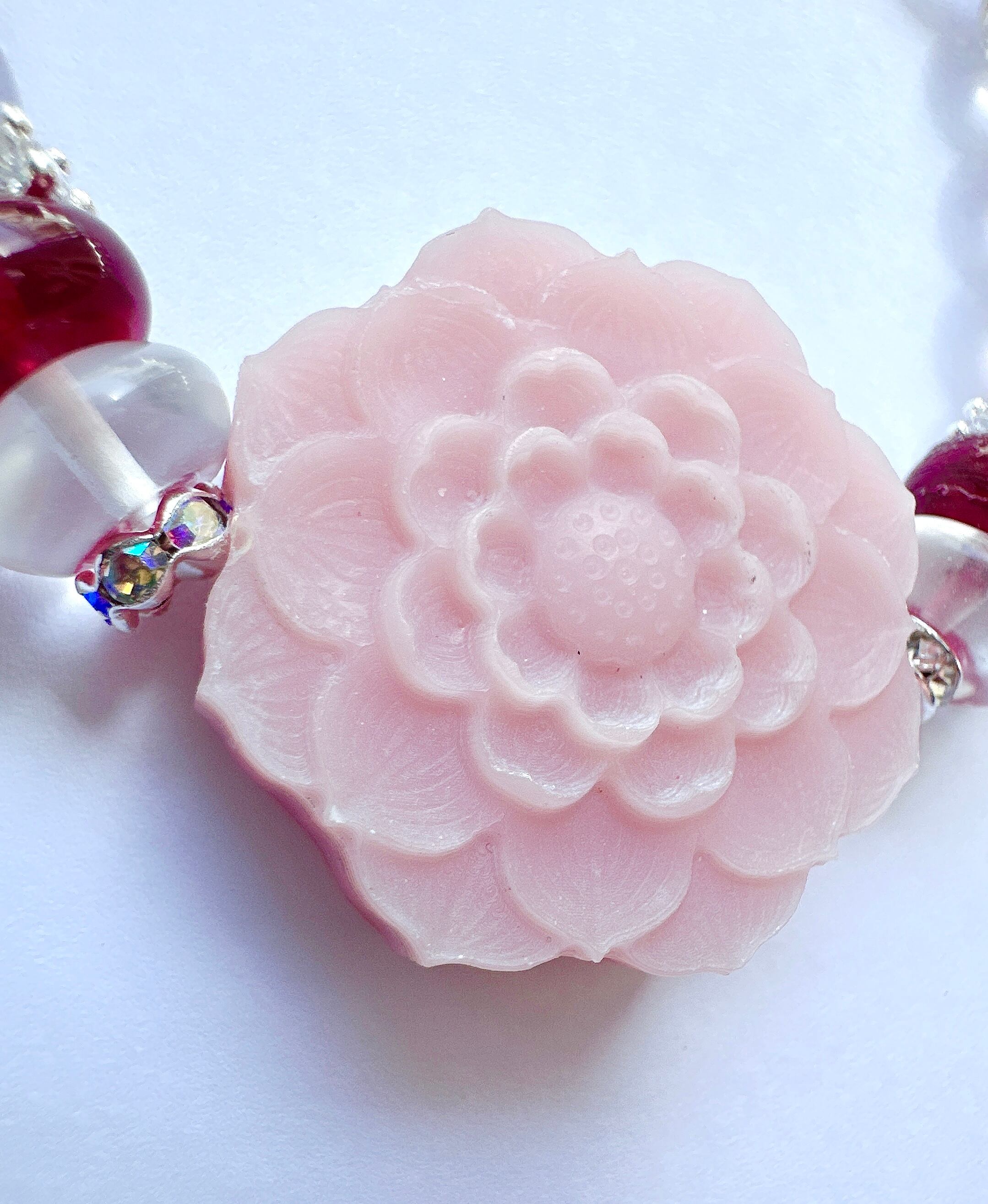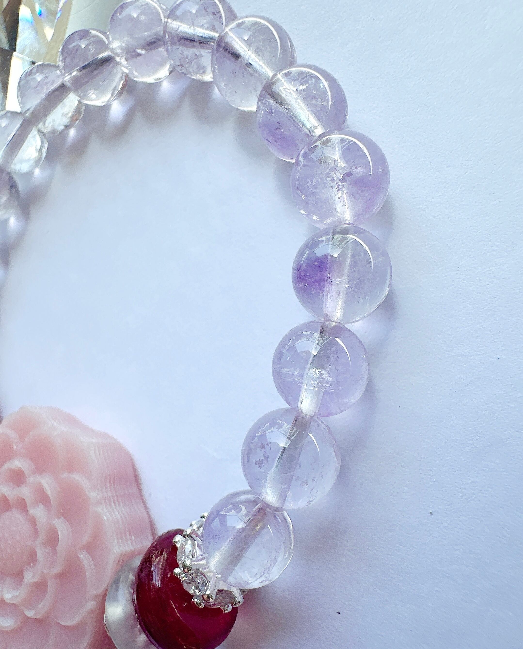 天然石 ブレスレット ピンクオパール 花 ラベンダーアメジスト 水晶は、可愛らしいピンクオパールの花をアクセントに、ラベンダーアメジストと水晶を組み合わせた天然石ブレスレットです。ピンクオパールは愛と癒しの石として知られ、ラベンダーアメジストはストレスを和らげる効果があります。水晶はパワーを高めるとされ、3種の石が組み合わさったパワフルな組み合わせとなっています。