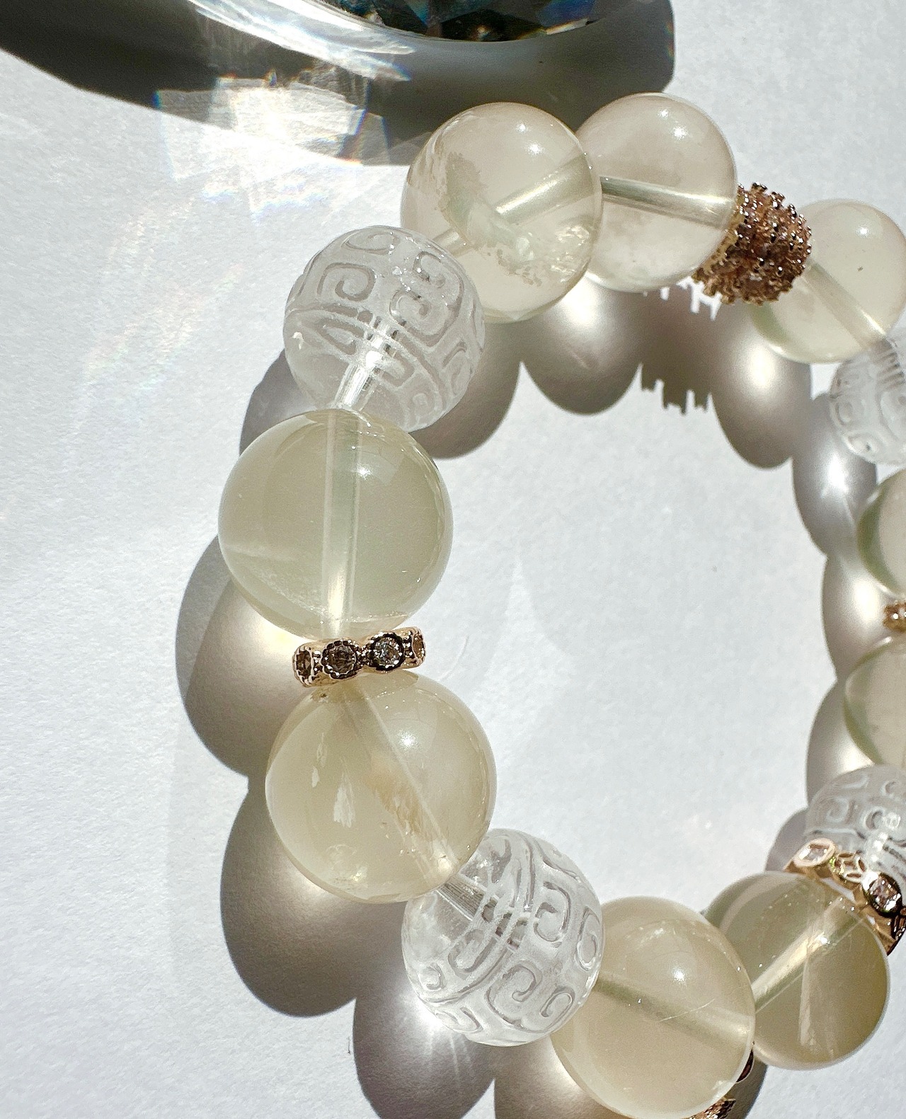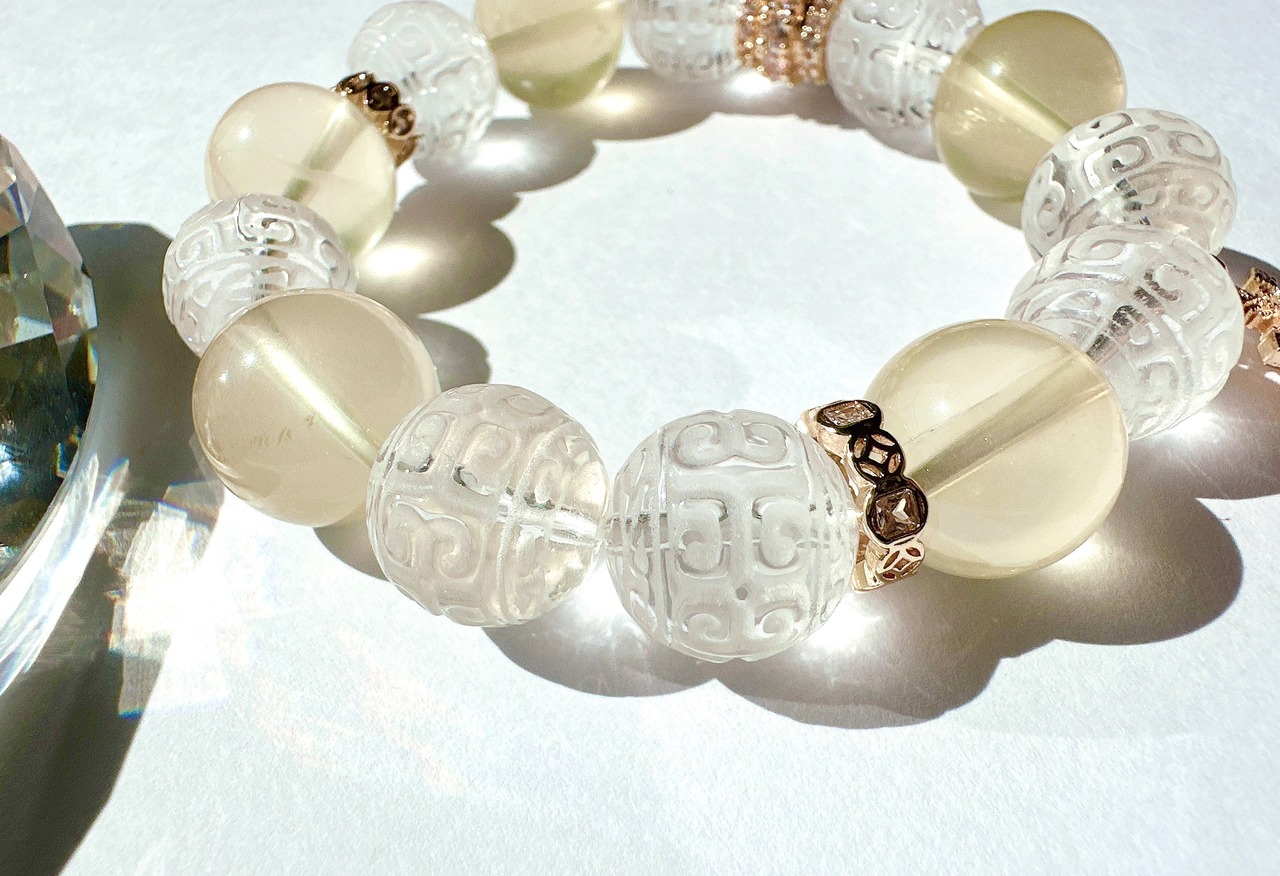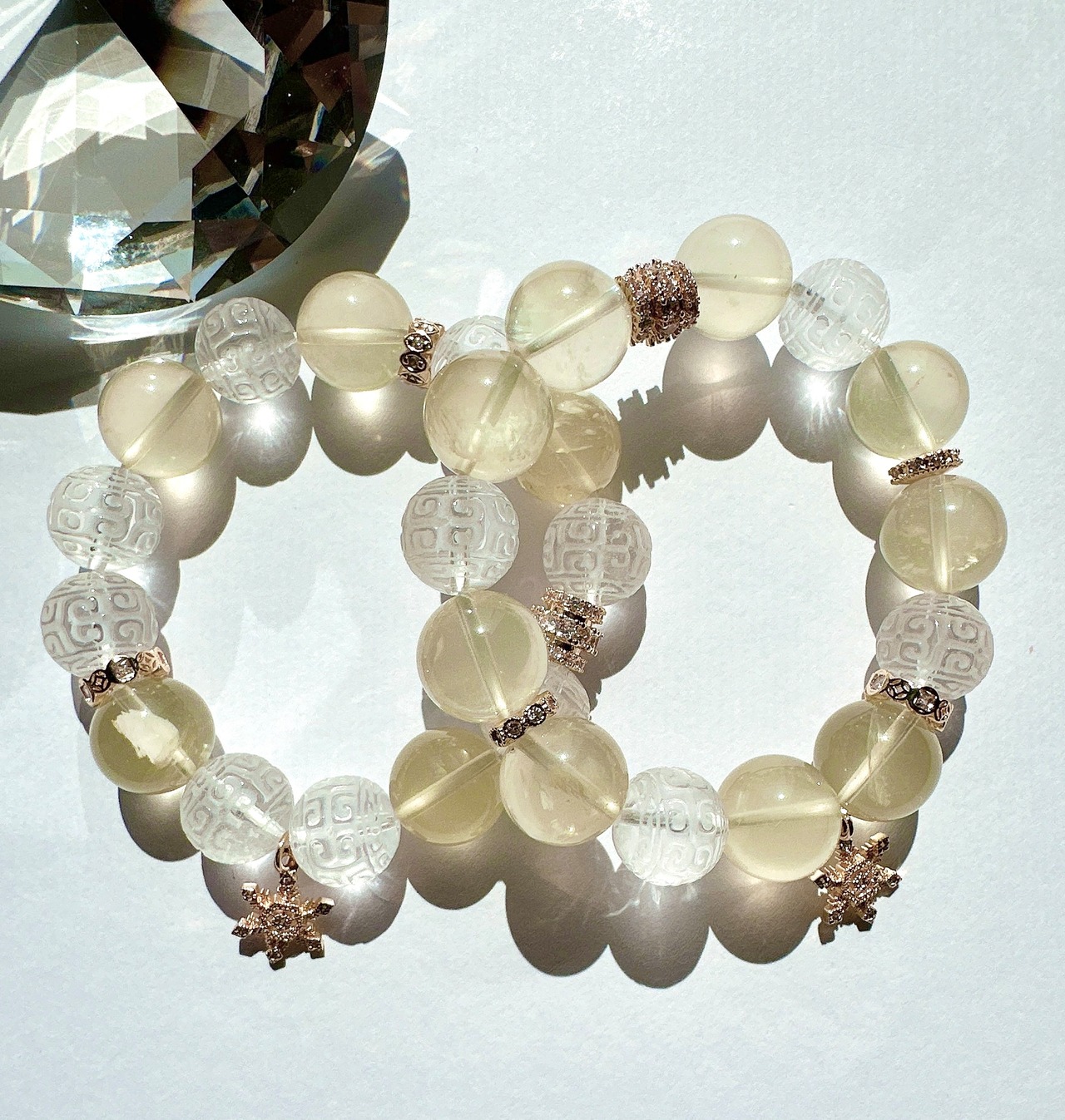 レモンクォーツとマニ車水晶が織り成すパワーストーンブレスレット。レモンクォーツは、ポジティブなエネルギーを引き寄せ、明るい気持ちをサポートしてくれます。一方のマニ車水晶は、浄化作用でマイナスエネルギーを排除し、パワーチャージを行ってくれます。この組み合わせで、日常生活や仕事のストレスから解放され、心身ともにバランスを取り戻せるでしょう。