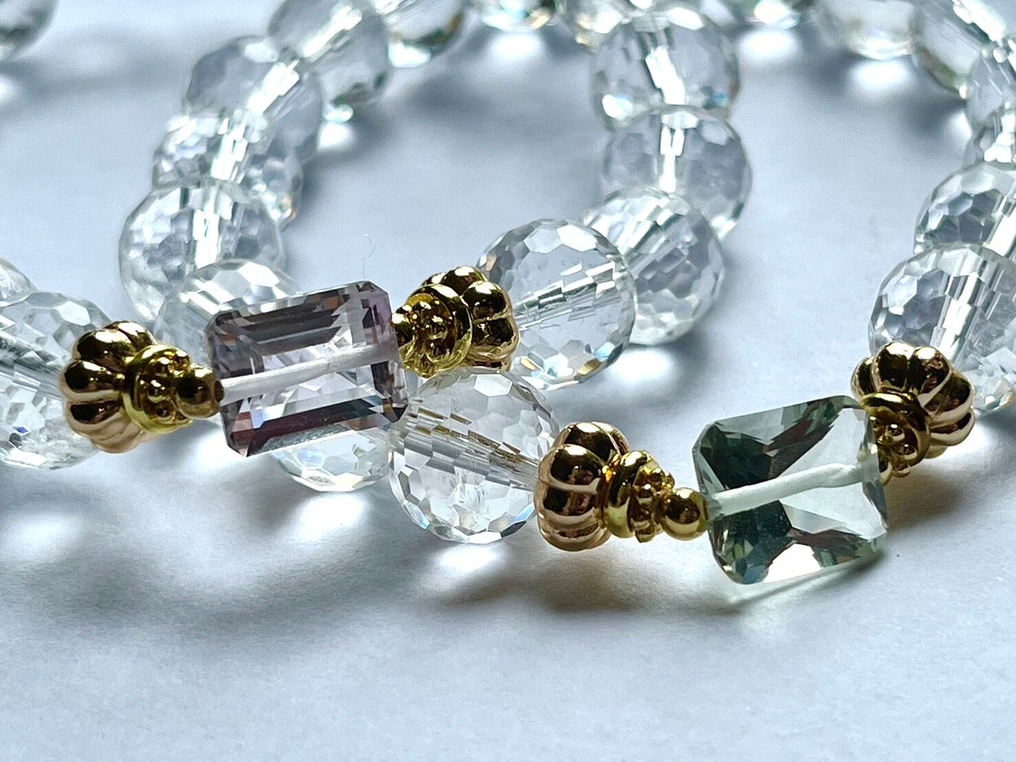 天然石のブレスレットには、スコロライト、グリーンクォーツ、そして水晶が散りばめられています。宝石ルースのスコロライトとグリーンクォーツに多面カットされた水晶が相まって、まるで星空を身にまとっているかのような輝きを放ちます。手首に巻くと、光が石たちを通して遊び心を持つ輝きに変えてくれます。