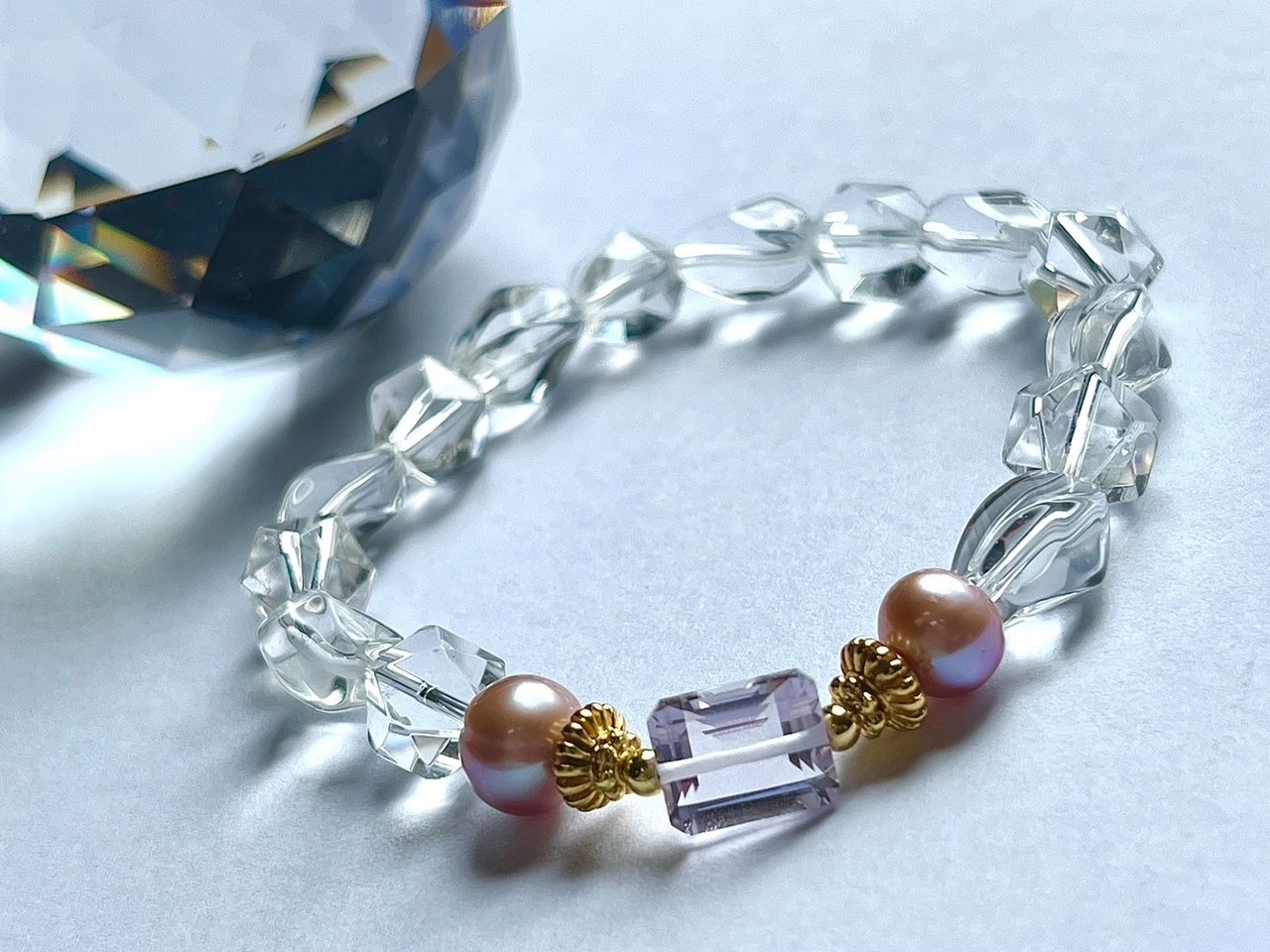 大人の女性にふさわしい洗練された輝きを放つ、天然石ブレスレットが登場しました。宝石ルースの美しさを堪能できるスコロライトに、上品な淡水パールとブロックカットの水晶を組み合わせた、エレガントなデザインが特徴です。腕元を華やかに飾り、日常の装いに上質な輝きをプラスしてくれる一点です。