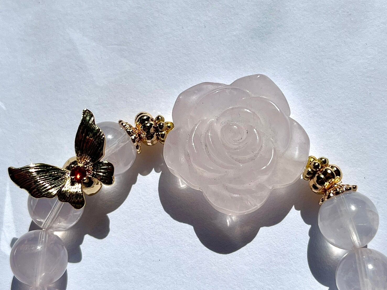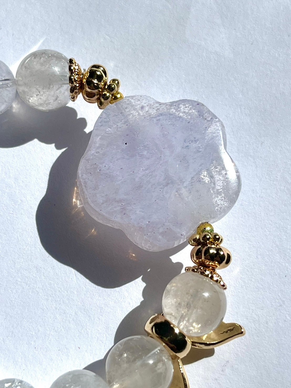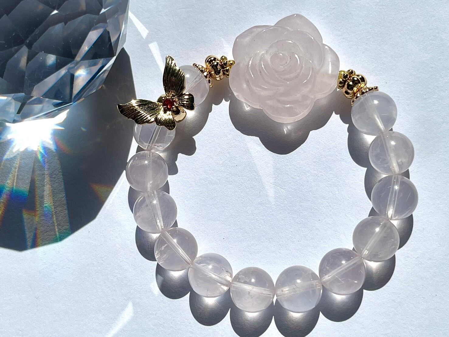 この天然石ブレスレットは、セリサイトインクォーツで作られた薔薇やローズクォーツで作られた薔薇に、ブリザードクリスタルを組み合わせた美しいアクセサリーです。セリサイトインクォーツは、クリアで透明感があることで知られ、パワフルな浄化作用を持っています。一方、ローズクォーツは愛と癒しを象徴し、心を穏やかにしてくれるパワーストーンです。
