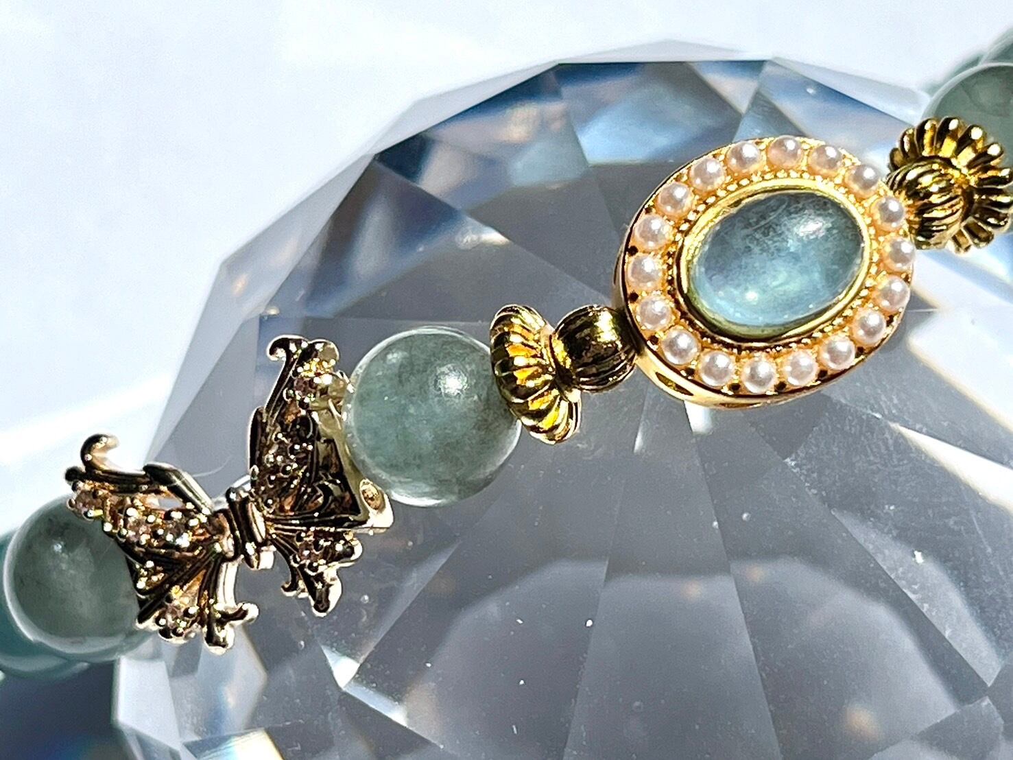 デビルアクアマリンとアクアマリンが織り成す、贅沢なブレスレットが登場しました。デビルアクアマリンは通常のアクアマリンにブラック色が入り、デビルアクアマリンならではの渋めのかっこよさが魅力のこのブレスレットは、洗練された装いを演出してくれます。デビルアクアマリンは、古代から幸運を呼び込むと言われ、穏やかな気持ちで心を癒す力を持つとされています。金具パーツと組み合わせることで、エレガントな雰囲気を醸し出します。