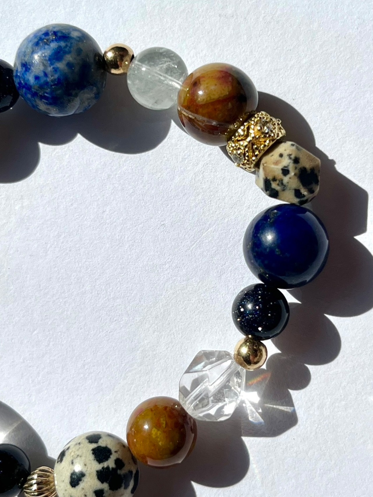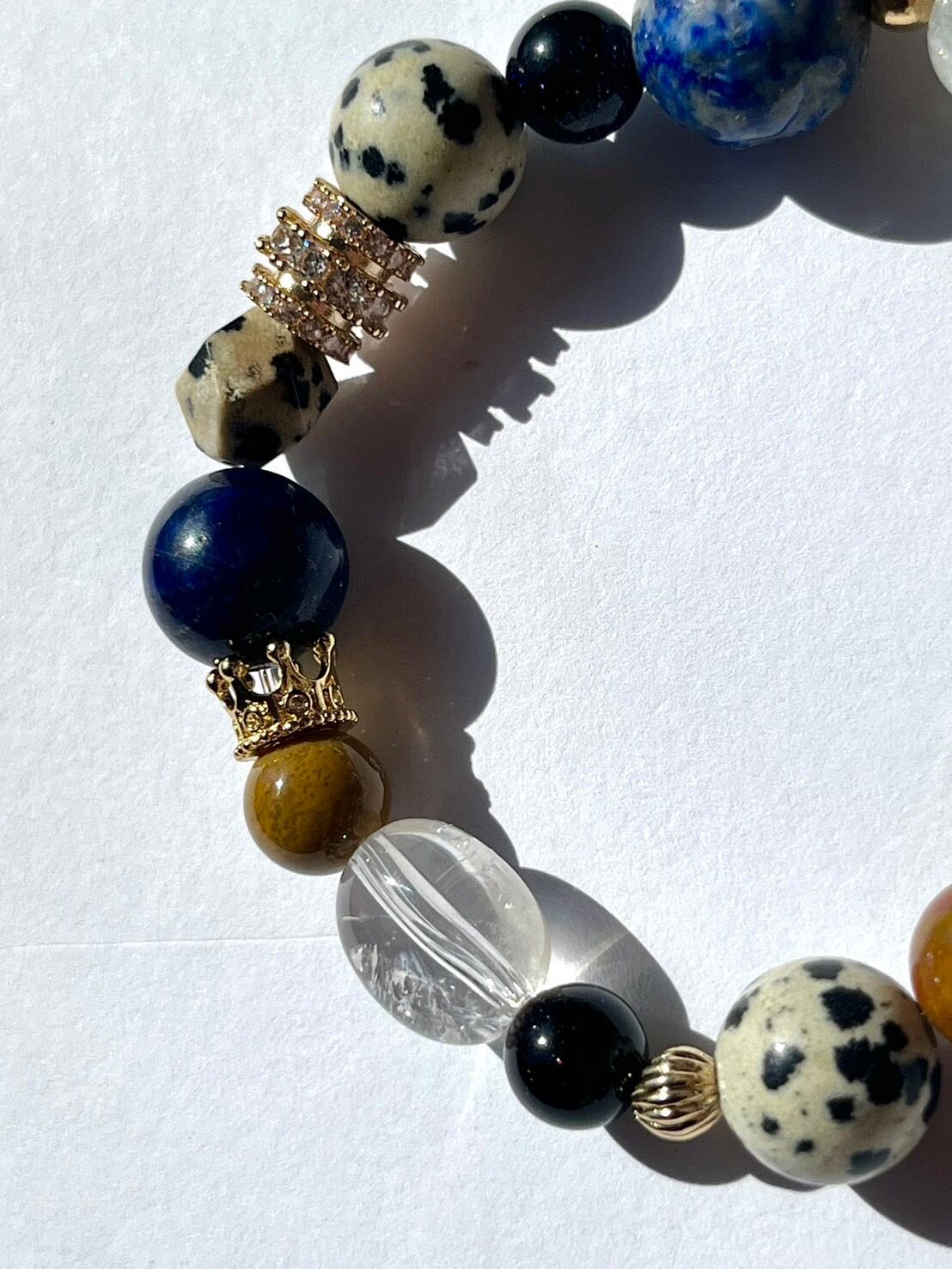 自然の恵みを身にまとう天然石ブレスレット。ダルメシアンジャスパー、ラピスラズリ、ブルーゴールドストーン、オーシャンジャスパー、水晶のパワーをまとった一点。ネガティブな感情を浄化し、成功への道を照らしてくれます。五つの石たちがあなたの心と体を包み込み、ポジティブなエネルギーで満たしてくれるでしょう。
