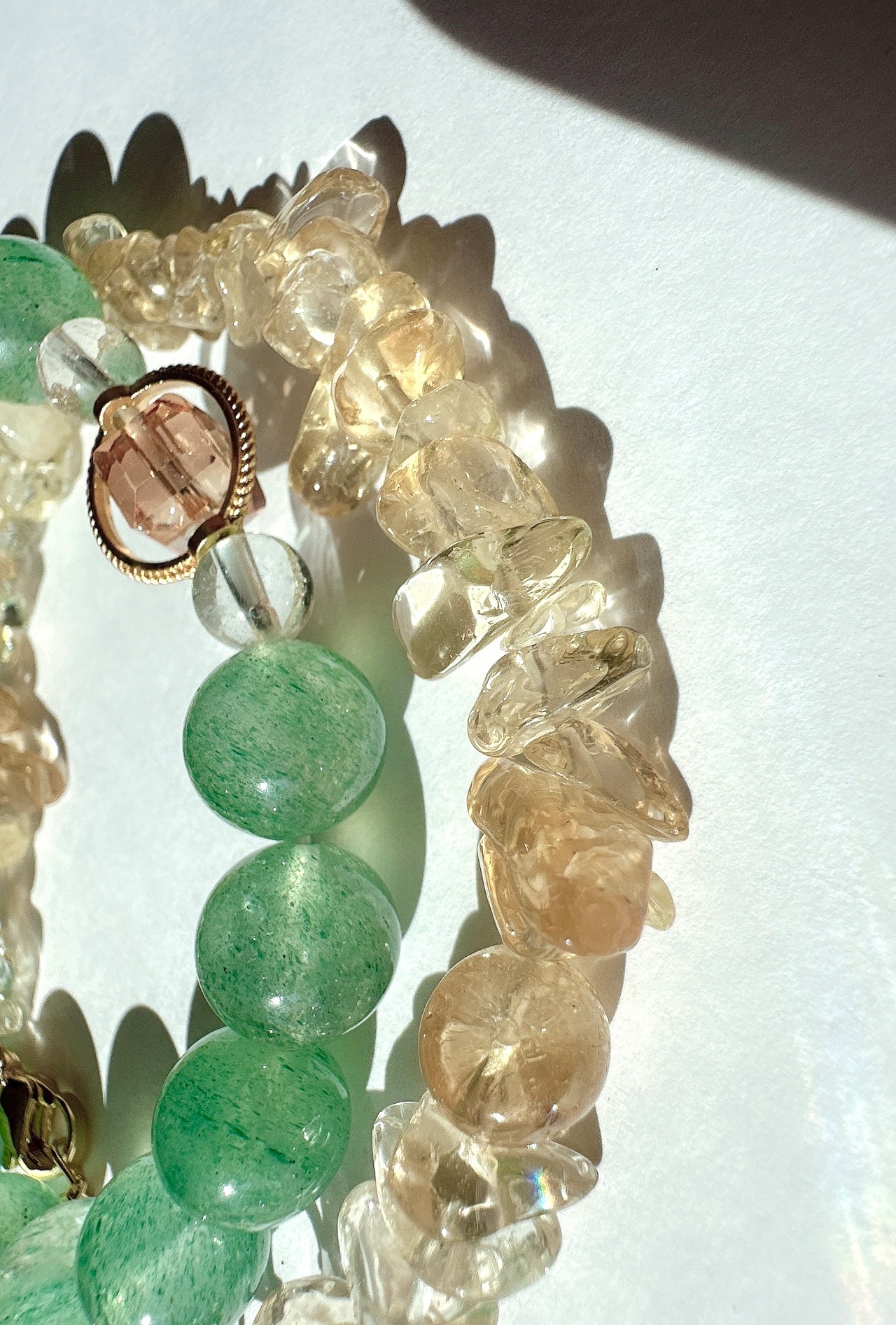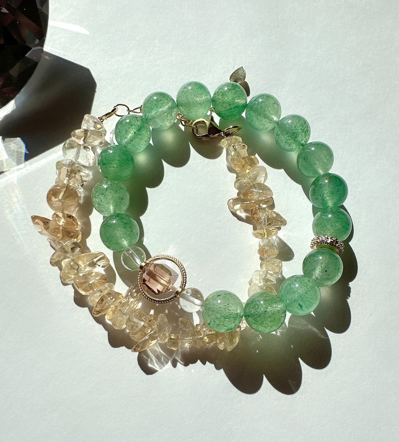 ワンランク上のおしゃれ感を演出する、グリーンストロベリークォーツとシトリンの2連タイプブレスレット。グリーンストロベリークォーツは愛と癒しの象徴であり、シトリンは富と成功を象徴するパワーストーン。これら2つの天然石を組み合わせたブレスレットは、持ち主に豊かな魅力とポジティブなエネルギーを呼び込んでくれることでしょう。