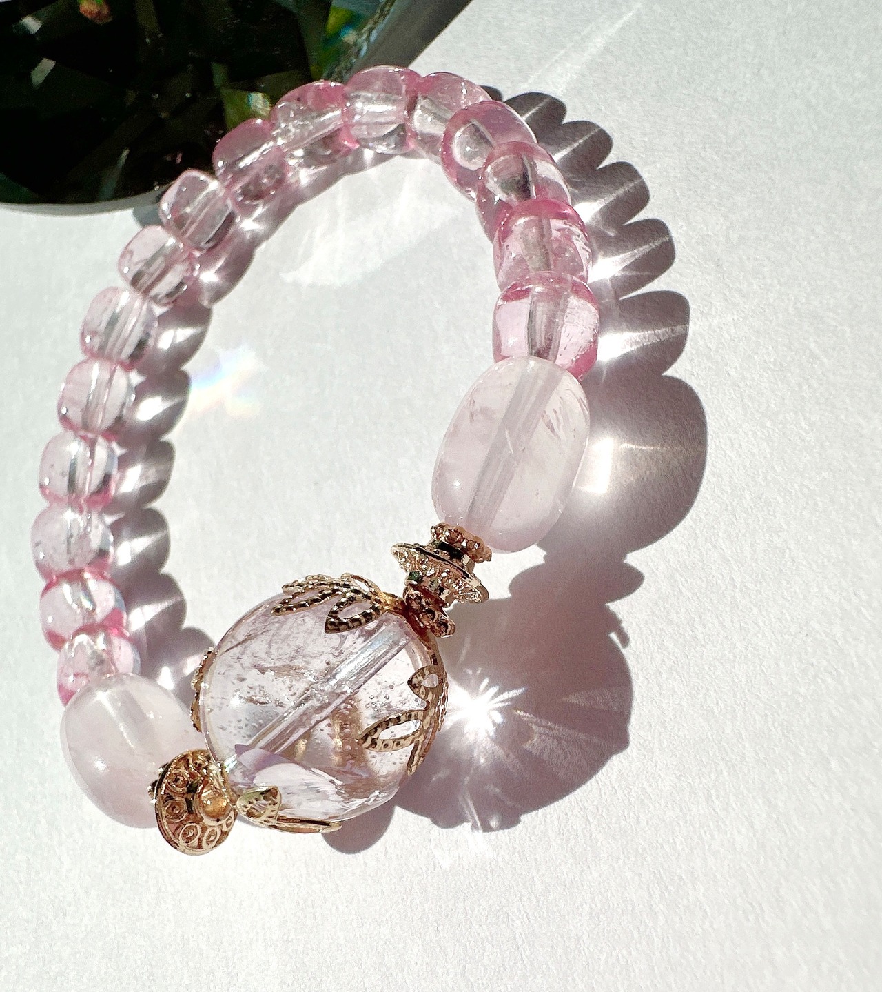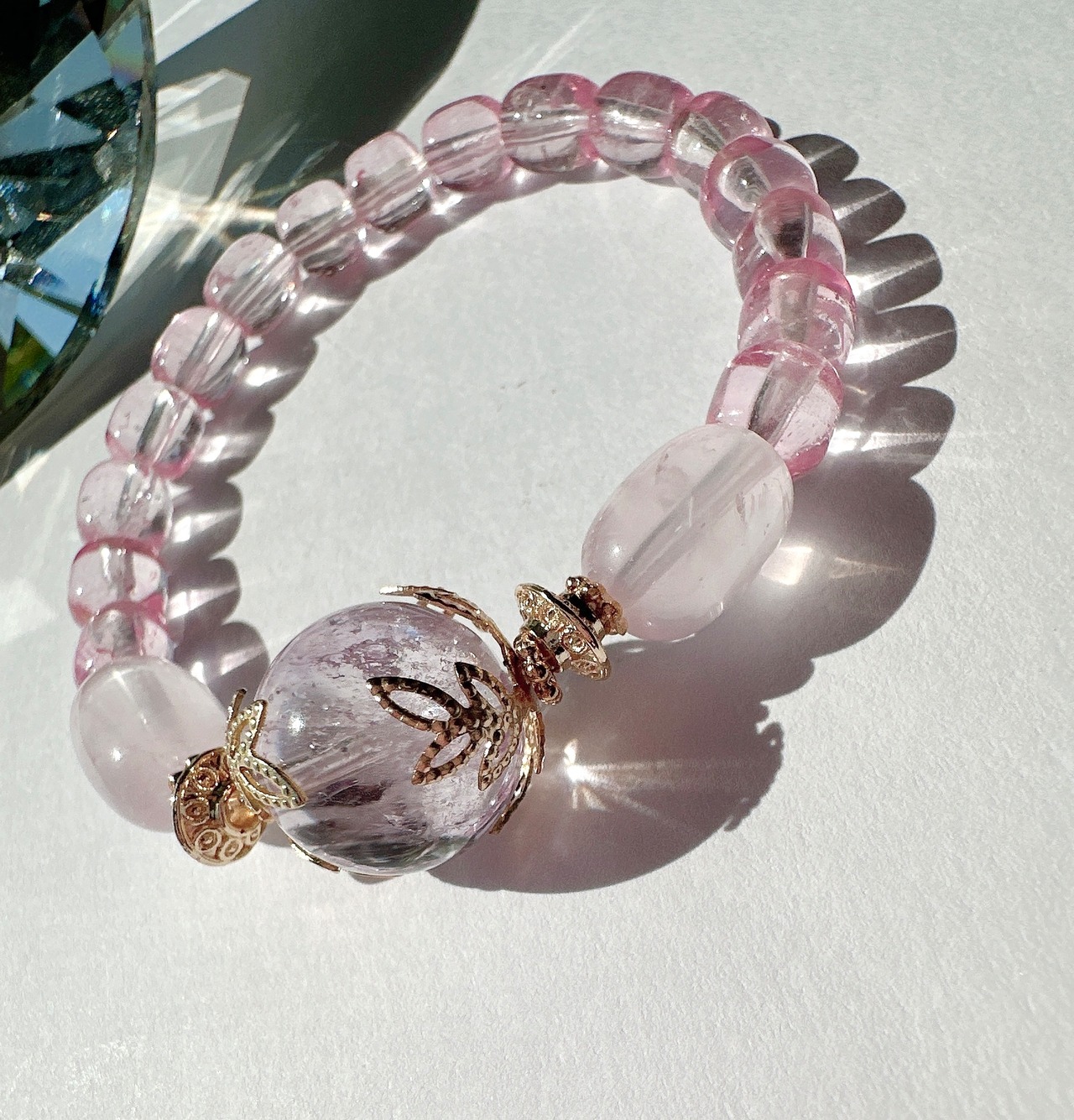 ラベンダーアメジスト、ローズクォーツ、そしてピンクトパーズが美しく組み合わさったこのブレスレットは、あなたの魅力を一層輝かせてくれます。ライトパープルのアメジストと、ピンクのトパーズが可憐な印象を与え、心地よいパワーを感じさせてくれることでしょう。