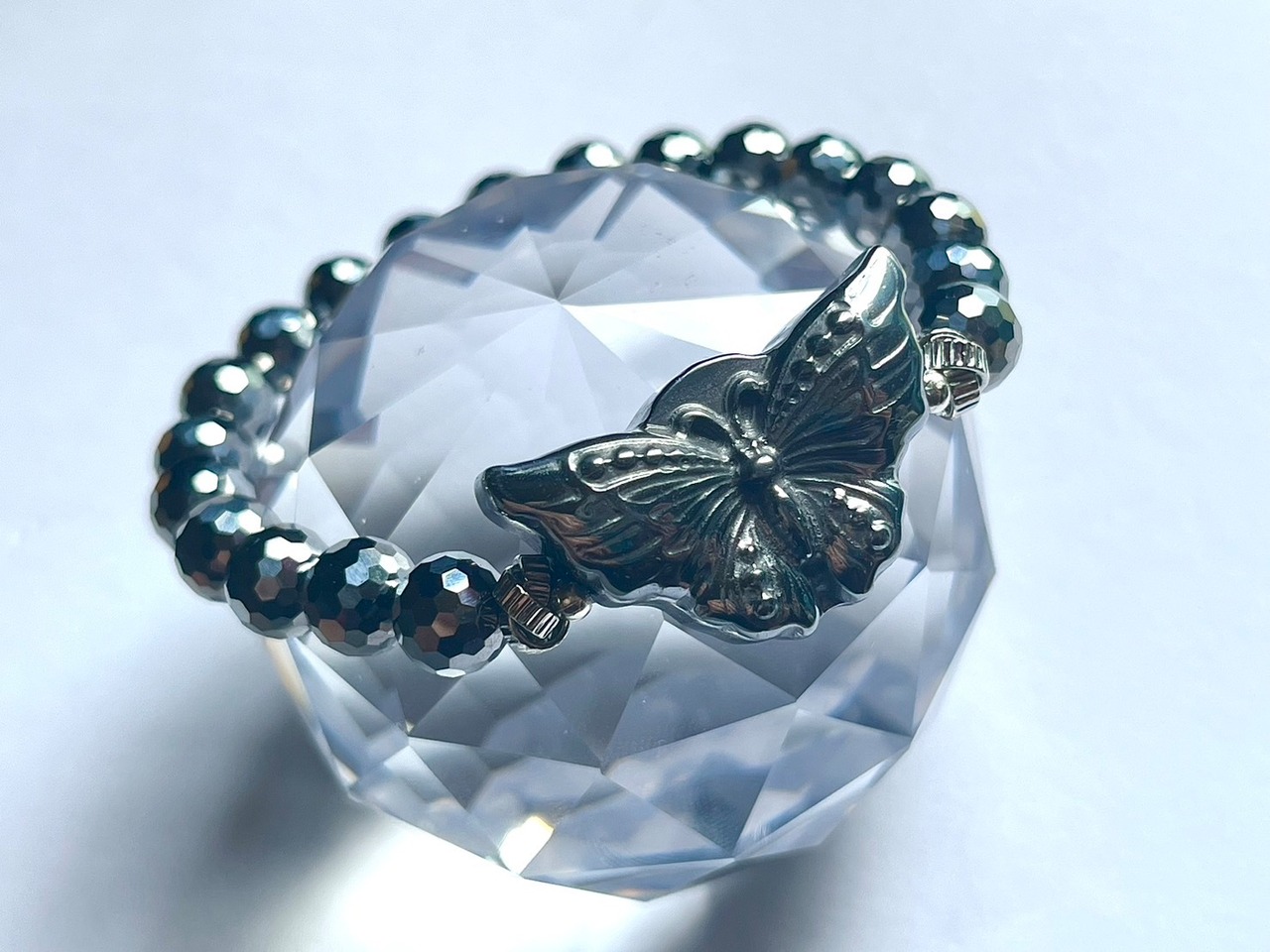 個性的でかっこいいデザインの天然石ブレスレットの新登場です!テラヘルツで作られた美しい蝶が、ブレスレットの中心で際立ち、あなたの手元を華やかに彩ります。このブレスレットは、日常のコーディネートに特別なアクセントを加え、どんなシーンでもあなたの魅力を引き立てるアイテムです。