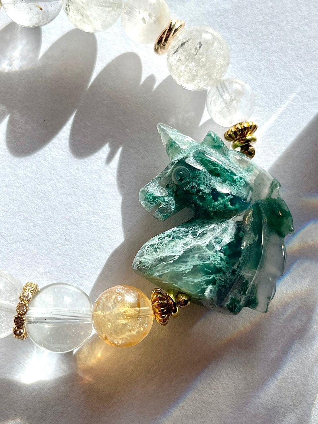 華やかで個性あふれるデザインの、天然石 ブレスレット モスアゲートが新登場です!モスアゲートのユニコーンをアクセントに、ゴールドルチルクォーツ、シトリン、ブリザードクォーツ、セリサイトインクォーツ、レモンクォーツ、水晶の各石が繊細に組み合わさり、あなたの手元に特別な輝きを与えます。このブレスレットは、日常のコーディネートに優雅さをプラスし、どんなシーンでもあなたの魅力を引き立てるアイテムです。