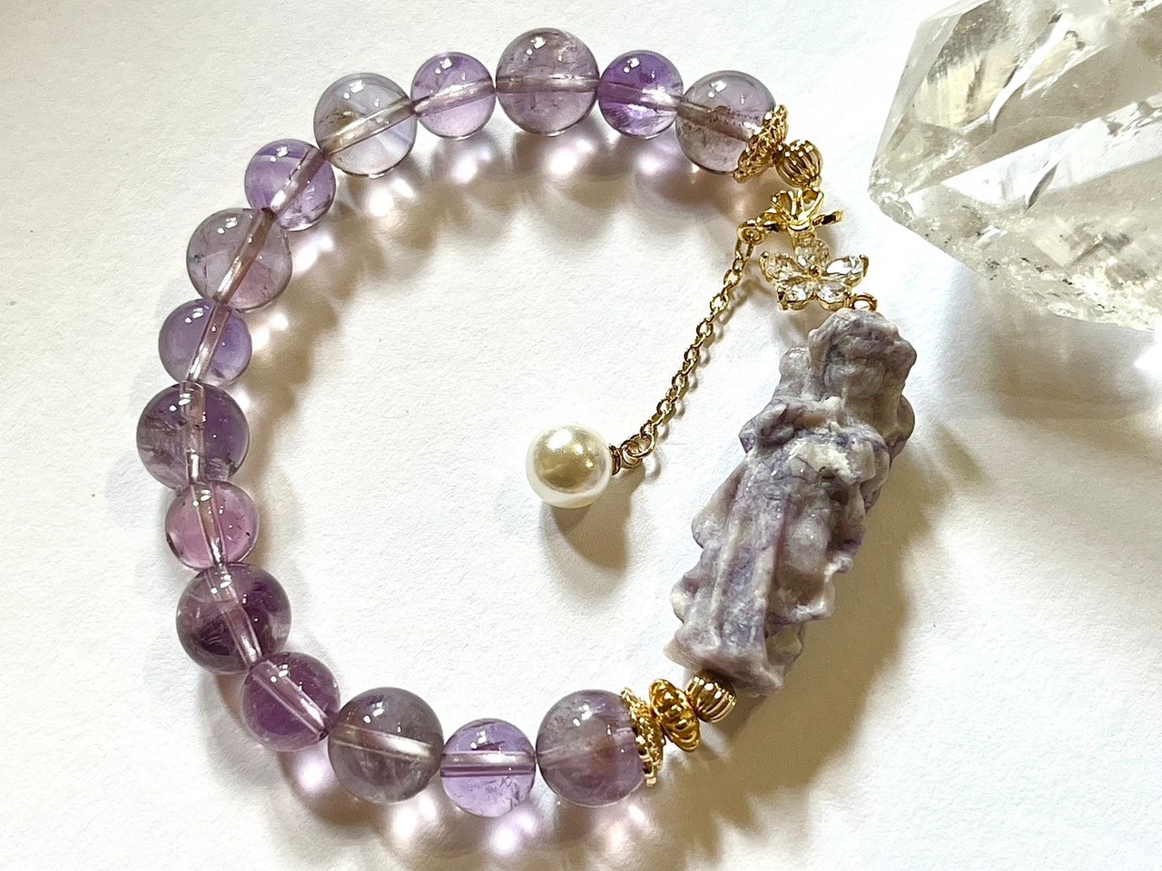 華やかで神秘的なデザインの、天然石 ブレスレット パープルハウライト 天使 ラベンダーアメジストが新登場です!パープルハウライトで作られた愛らしい天使と、柔らかな色合いのラベンダーアメジストが繊細に組み合わさり、あなたの手元に特別な輝きを与えます。このブレスレットは、日常のコーディネートに心豊かなアクセントを加え、どんなシーンでもあなたの魅力を引き立てるアイテムです。
