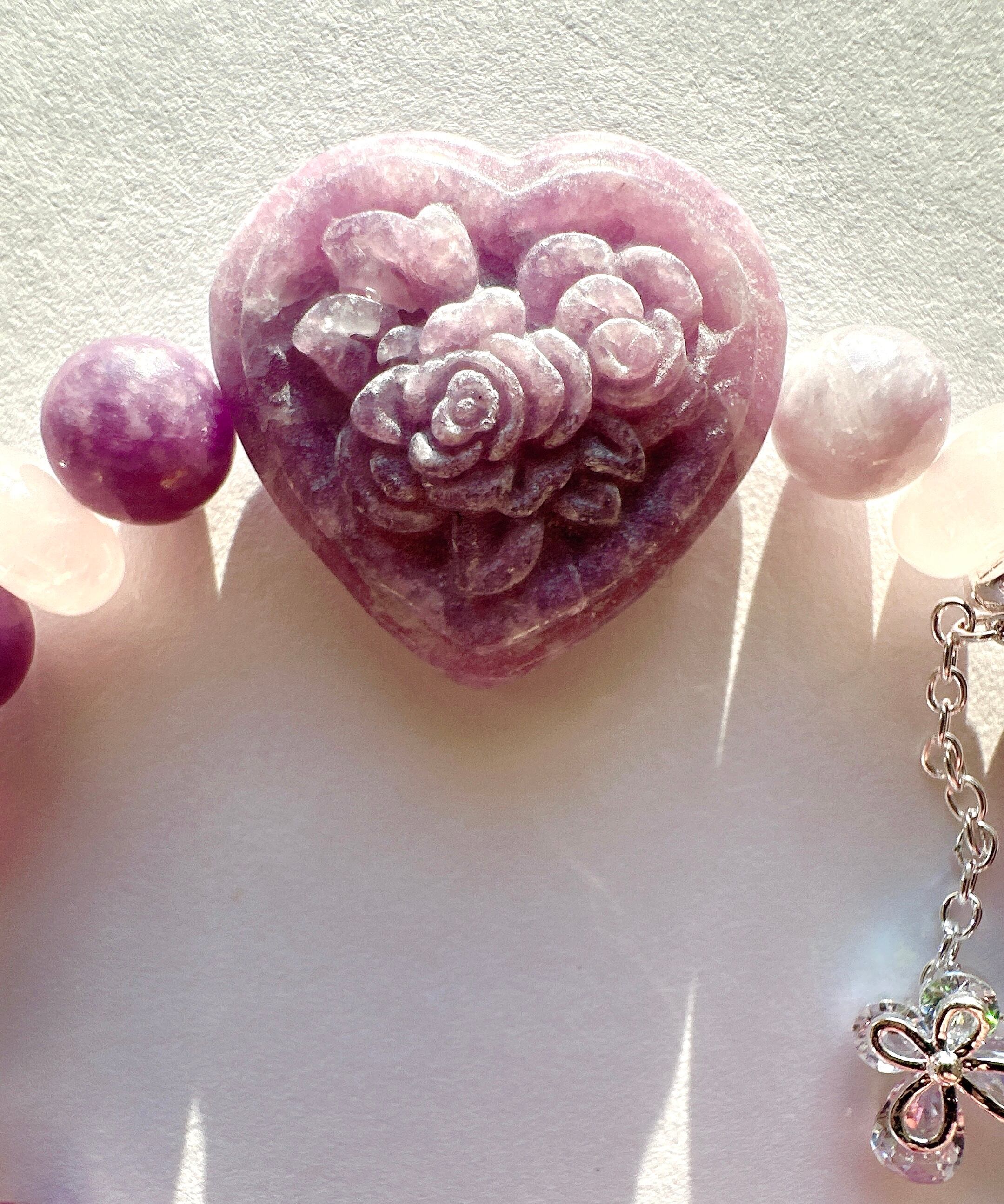 華やかで大人可愛いデザインの、天然石 ブレスレット レピドライト 花 ハート パープルマイカインシリカ ユニコーン ローズクォーツ パワーストーンが新登場です!繊細なレピドライトのハートと花のモチーフに、神秘的なパープルマイカインシリカ、魅力溢れるユニコーン、愛の象徴であるローズクォーツを組み合わせたこのブレスレットは、あなたの手元を美しく彩り、心にエネルギーと優しさを与えます。