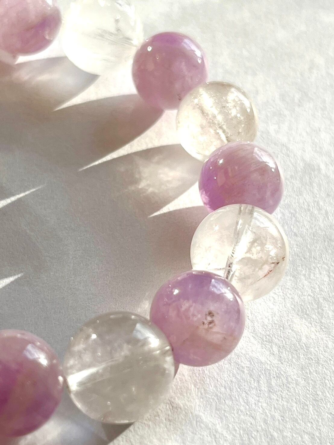 ラベンダーアメジストは、その穏やかな色合いが特徴で、心を落ち着け、リラックス効果が期待できる石とされています。水晶は、エネルギーを浄化し、ポジティブなエネルギーを引き寄せる万能の石として広く知られています。このブレスレットはシンプルでありながら、個性的な魅力を放ち、デイリーなファッションから特別な場面まで幅広くご使用いただける一品です。