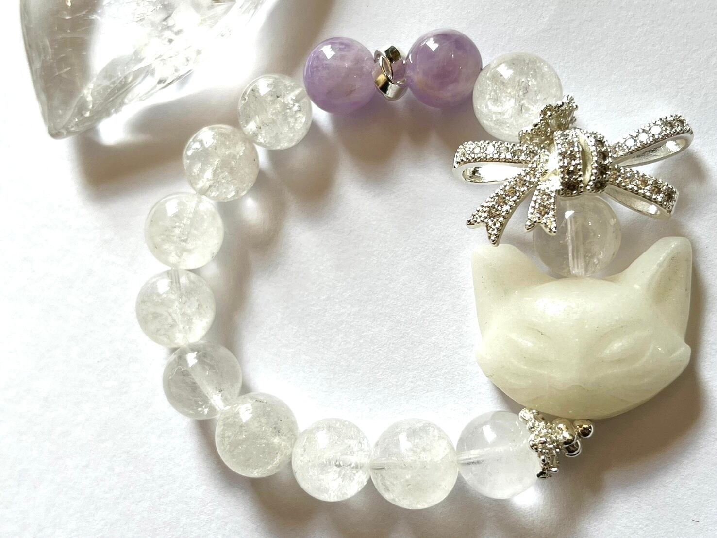 天然石 ブレスレット 猫 ホワイトジェイド ブリザードクォーツ ラベンダーアメジスト パワーストーン