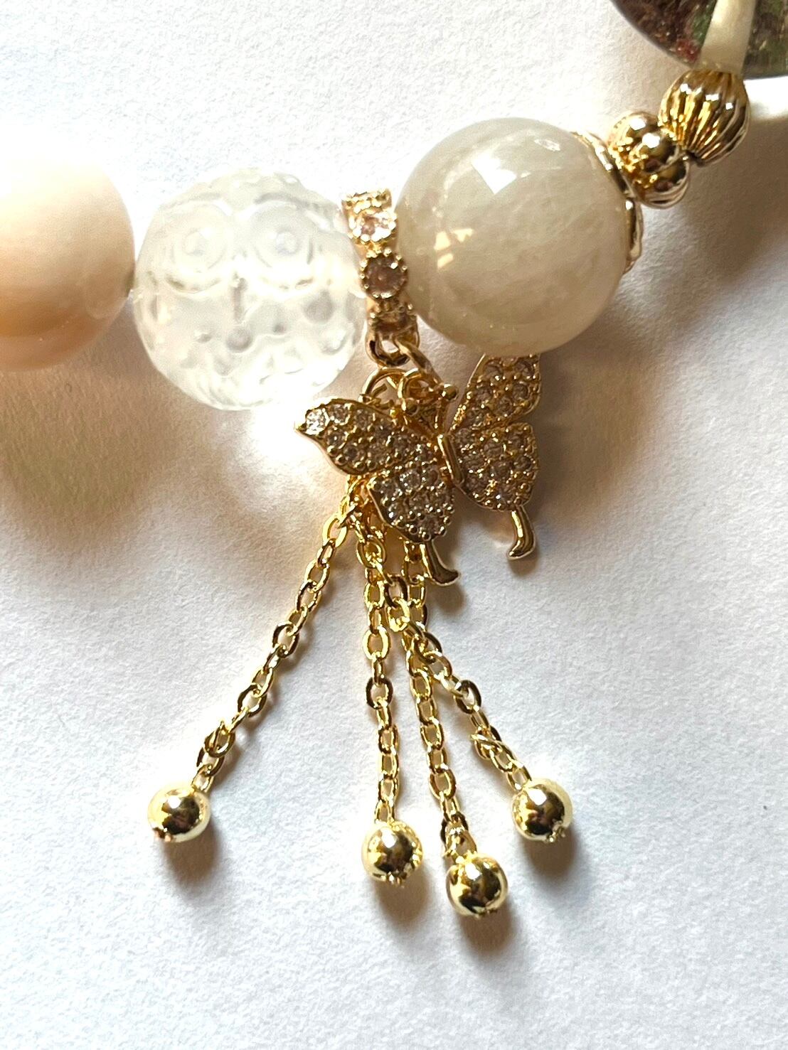 四季ガーデンクォーツは自然のエネルギーを感じさせ、心に安らぎを与えると言われています。ラビットヘアーは幸運や豊かさを象徴し、優れたインスピレーションをもたらします。また、水晶のフクロウは知恵と直感を高め、心のバランスを整える効果が期待されます。このブレスレットはシンプルでありながらも魅力的な存在感があり、デイリーなファッションから特別な場面まで幅広くご使用いただける一品です。